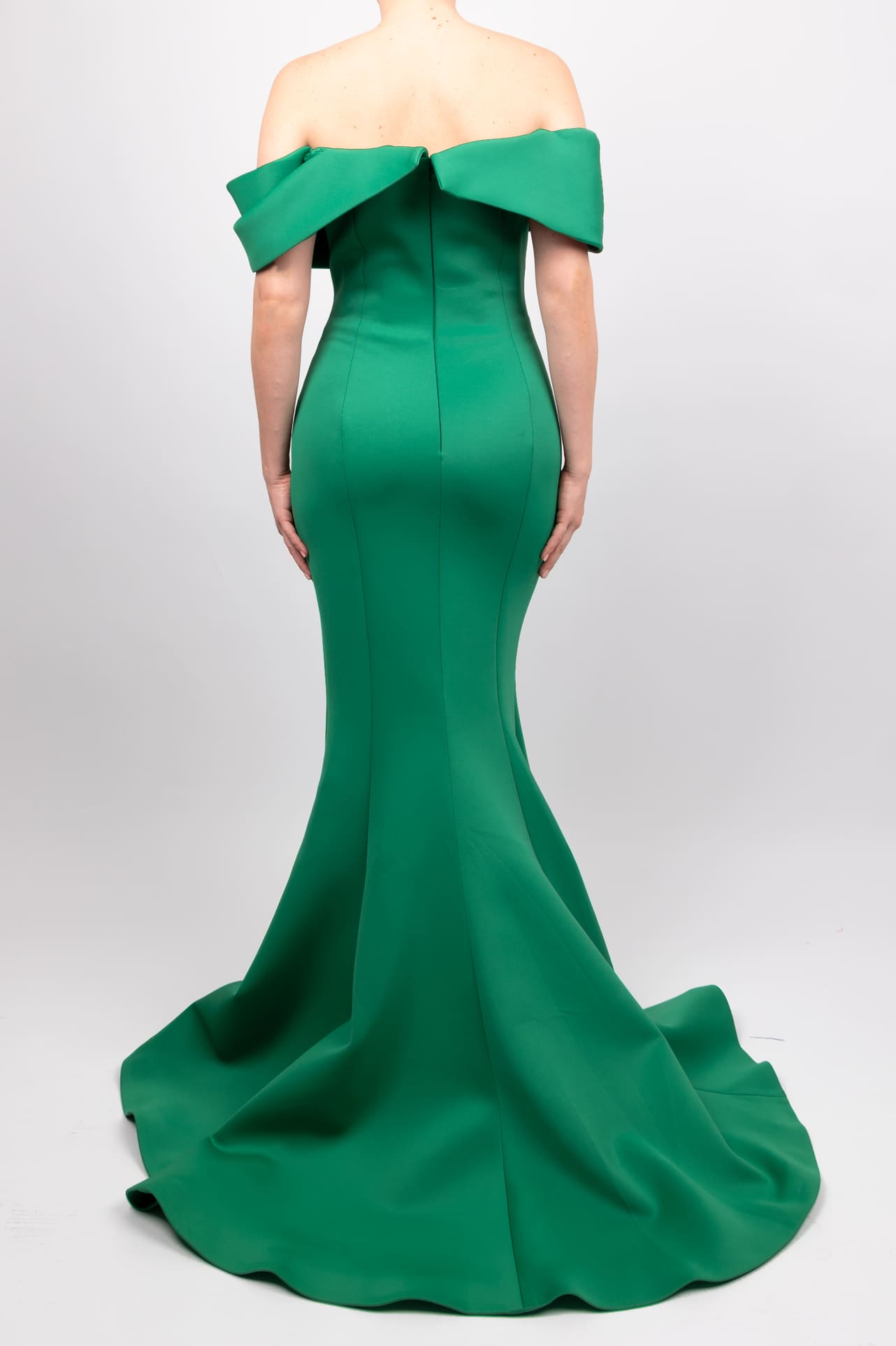 Vestido off the shoulder abertura en pierna verde