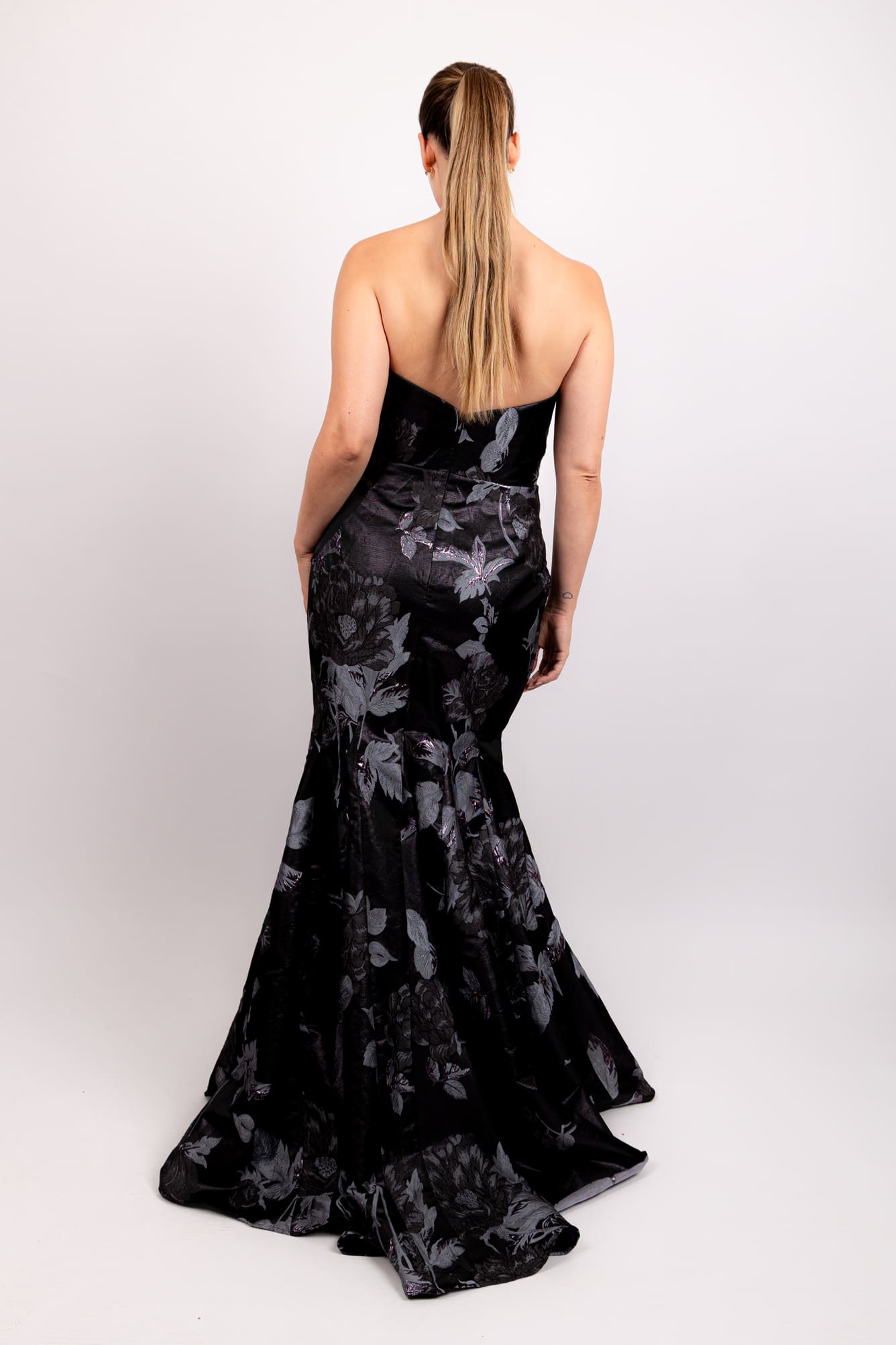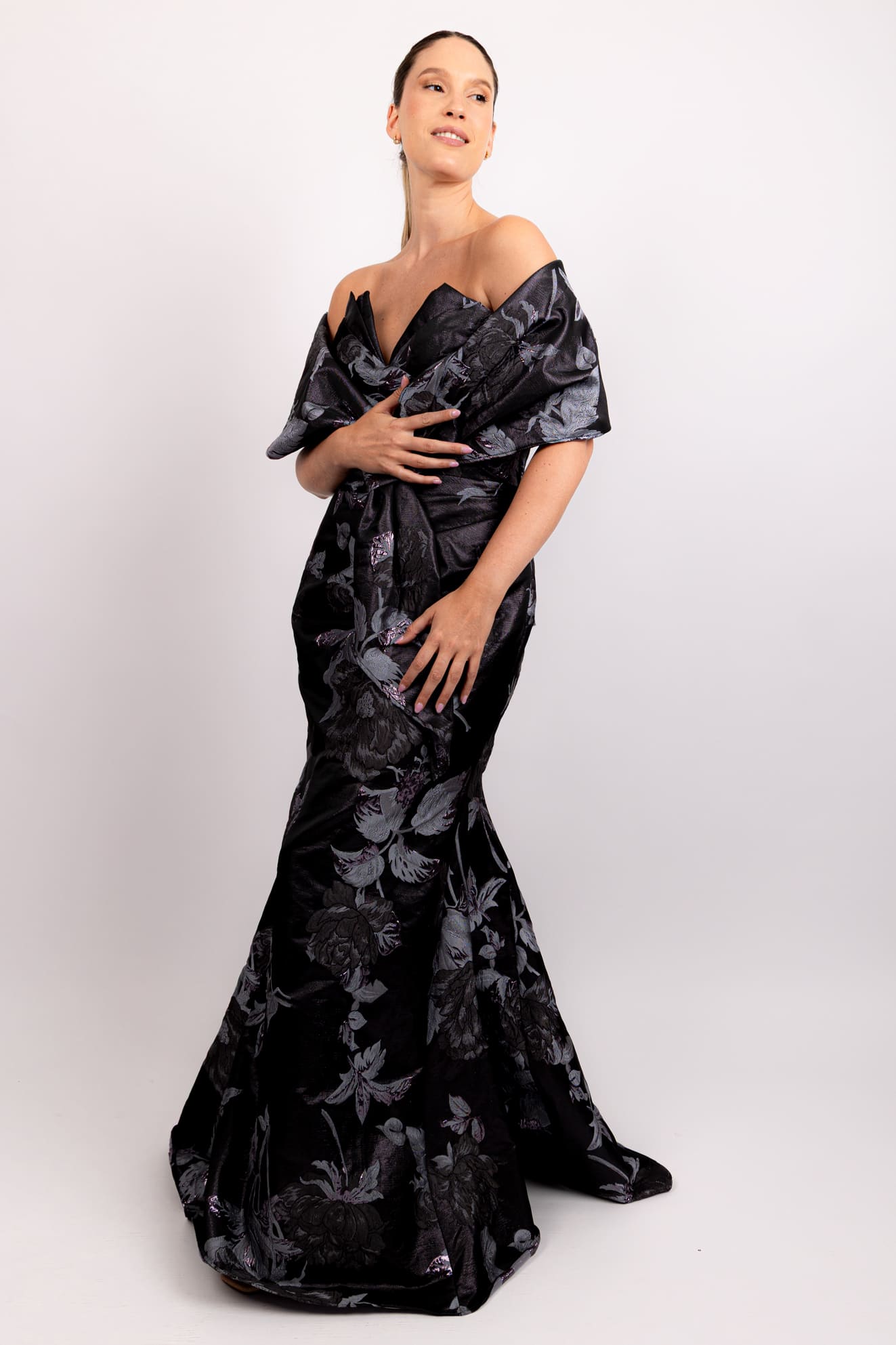 Vestido strapless brocado con capa cruzada gris