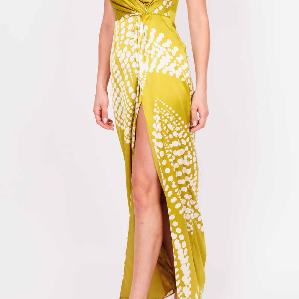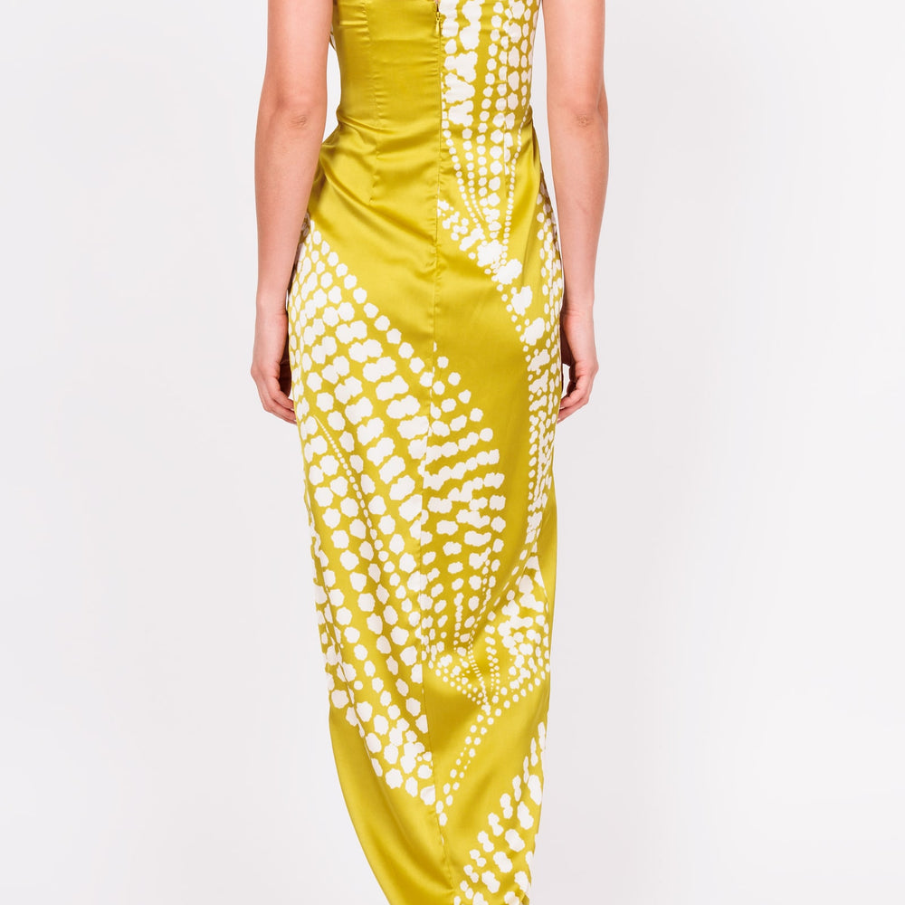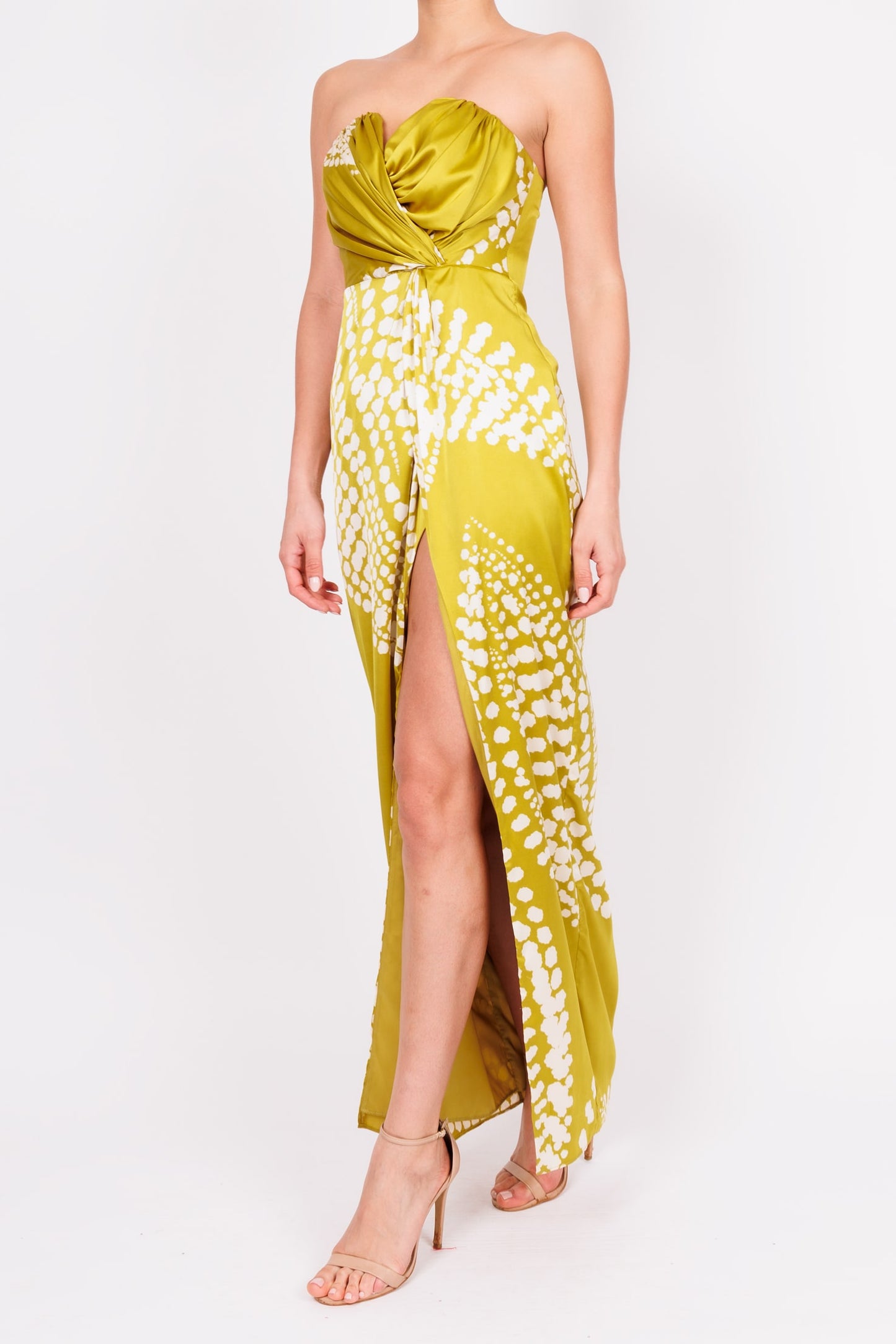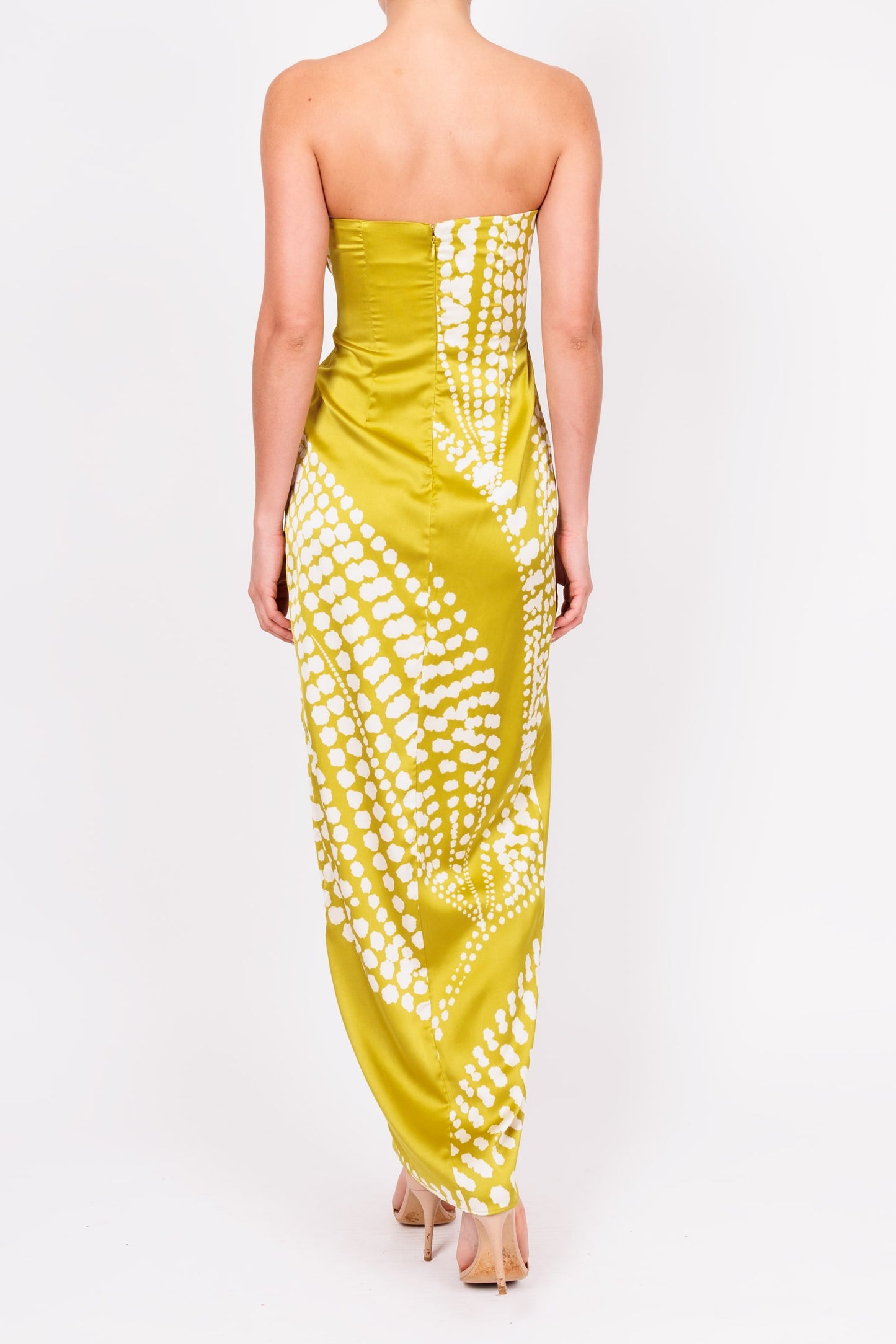 Vestido strapless de satin verde claro con puntos blancos