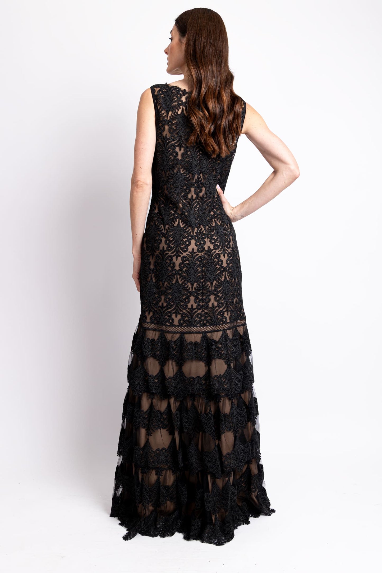 Vestido cuello redondo de encaje negro fondo nude