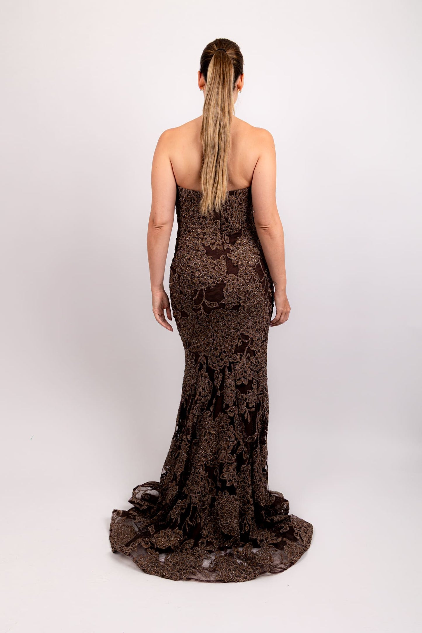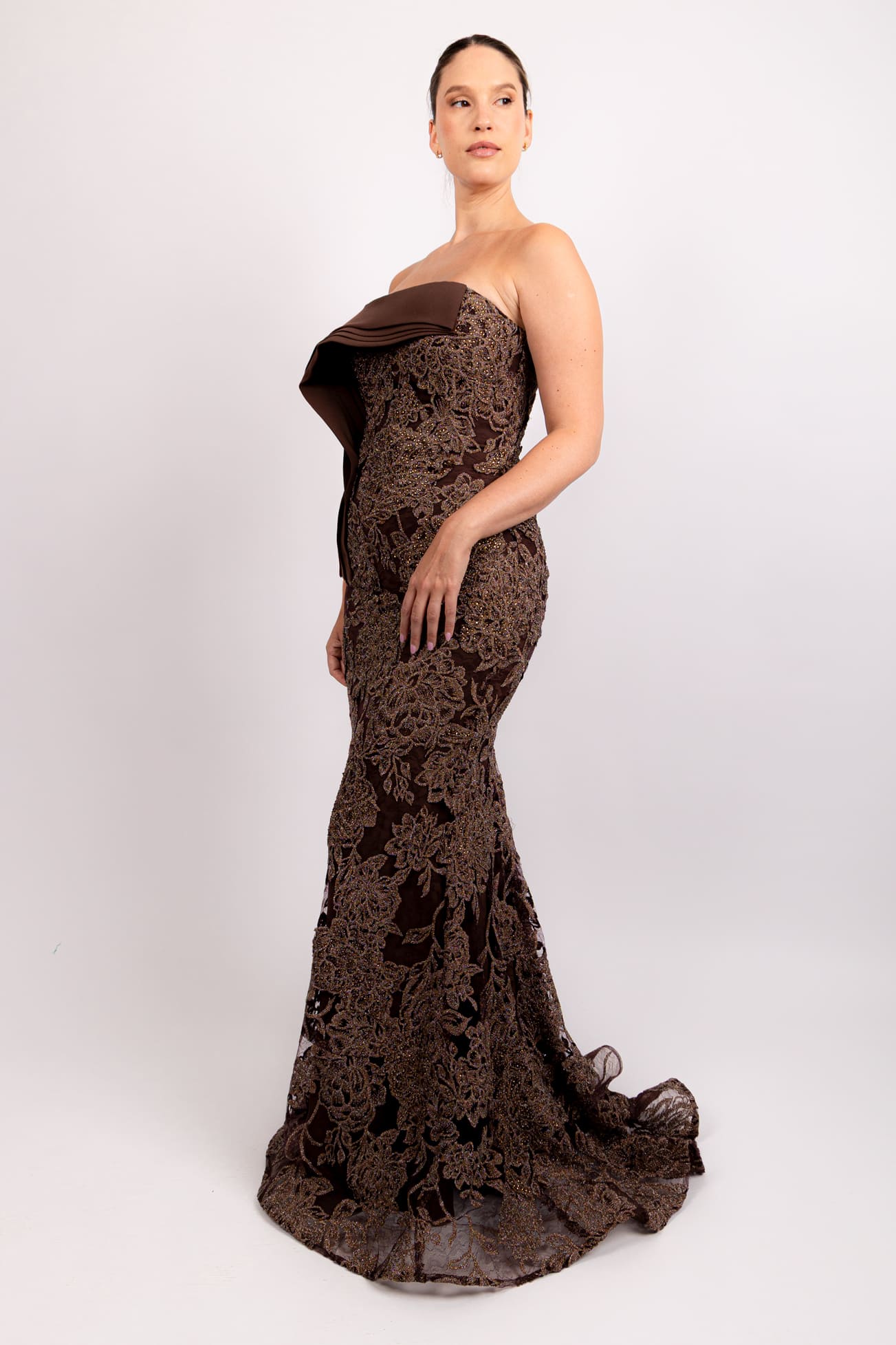 Vestido strapless brocado cafe con terciopelo
