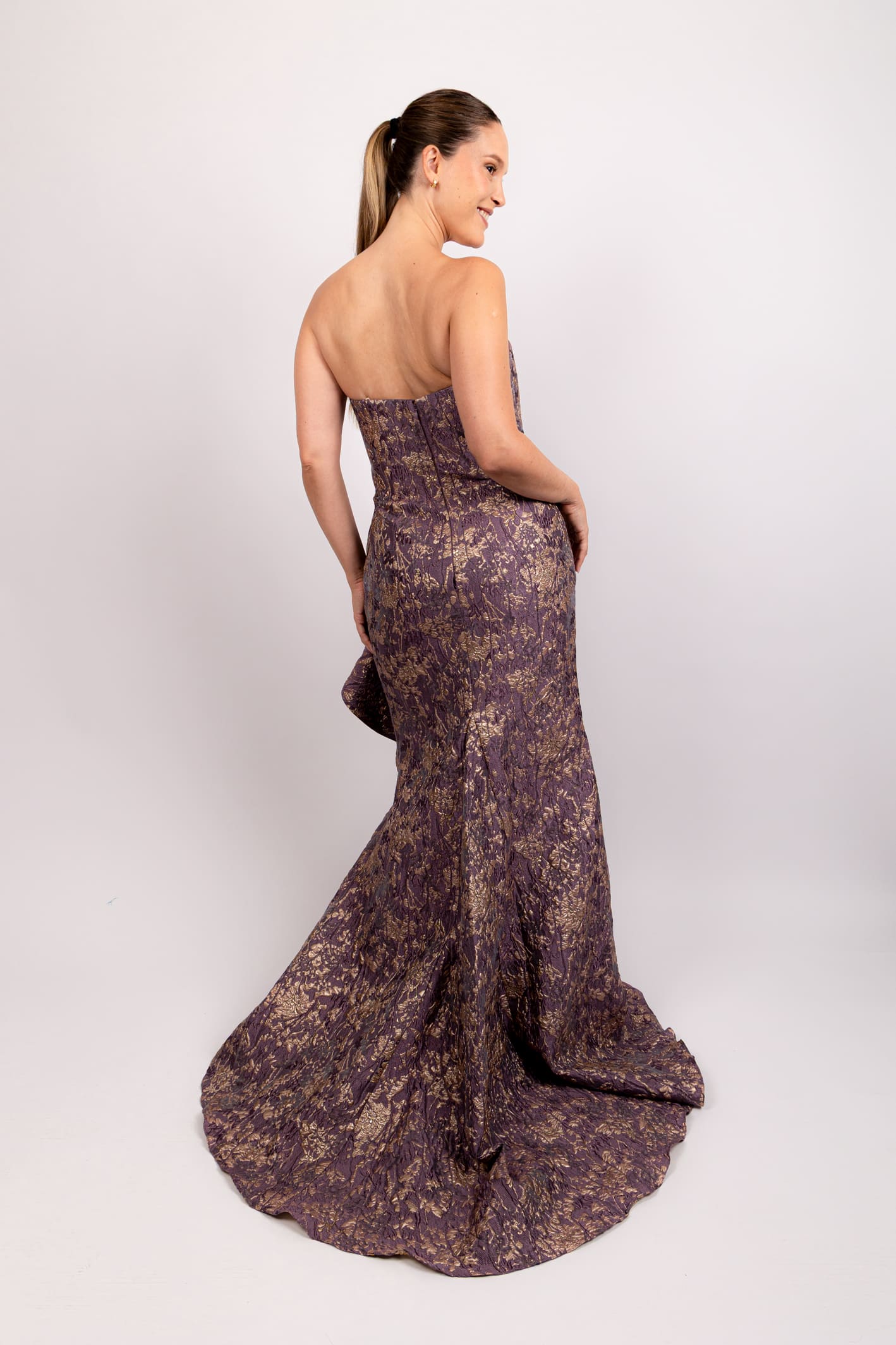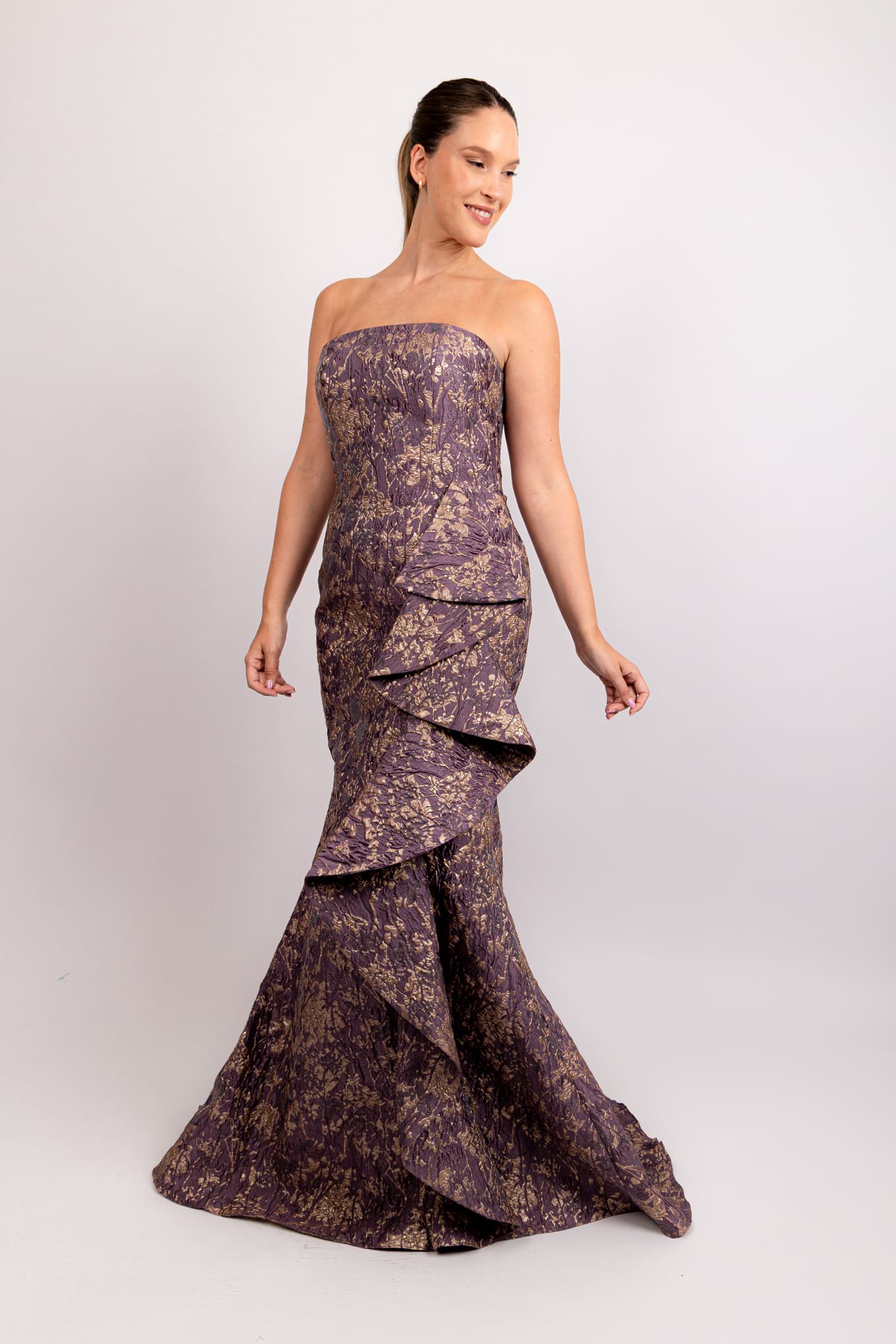 Vestido strapless brocado con olan lila gris