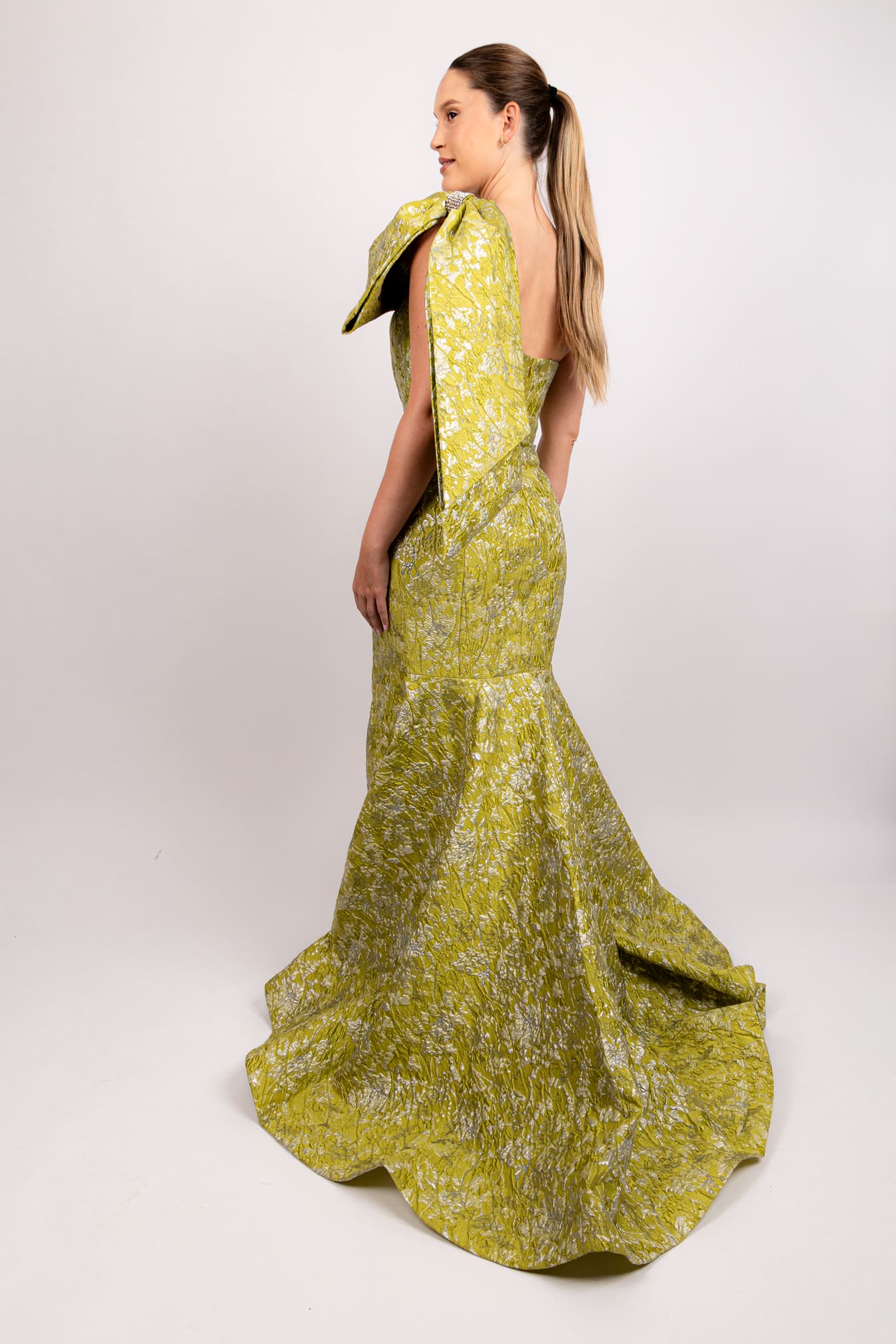 Vestido un hombro brocado amarillo con moño