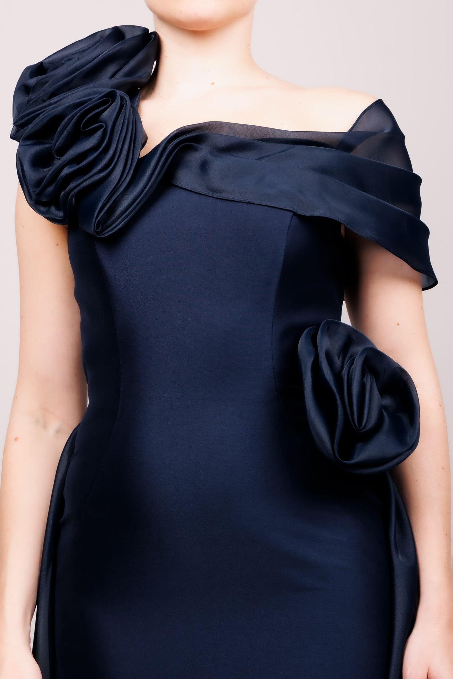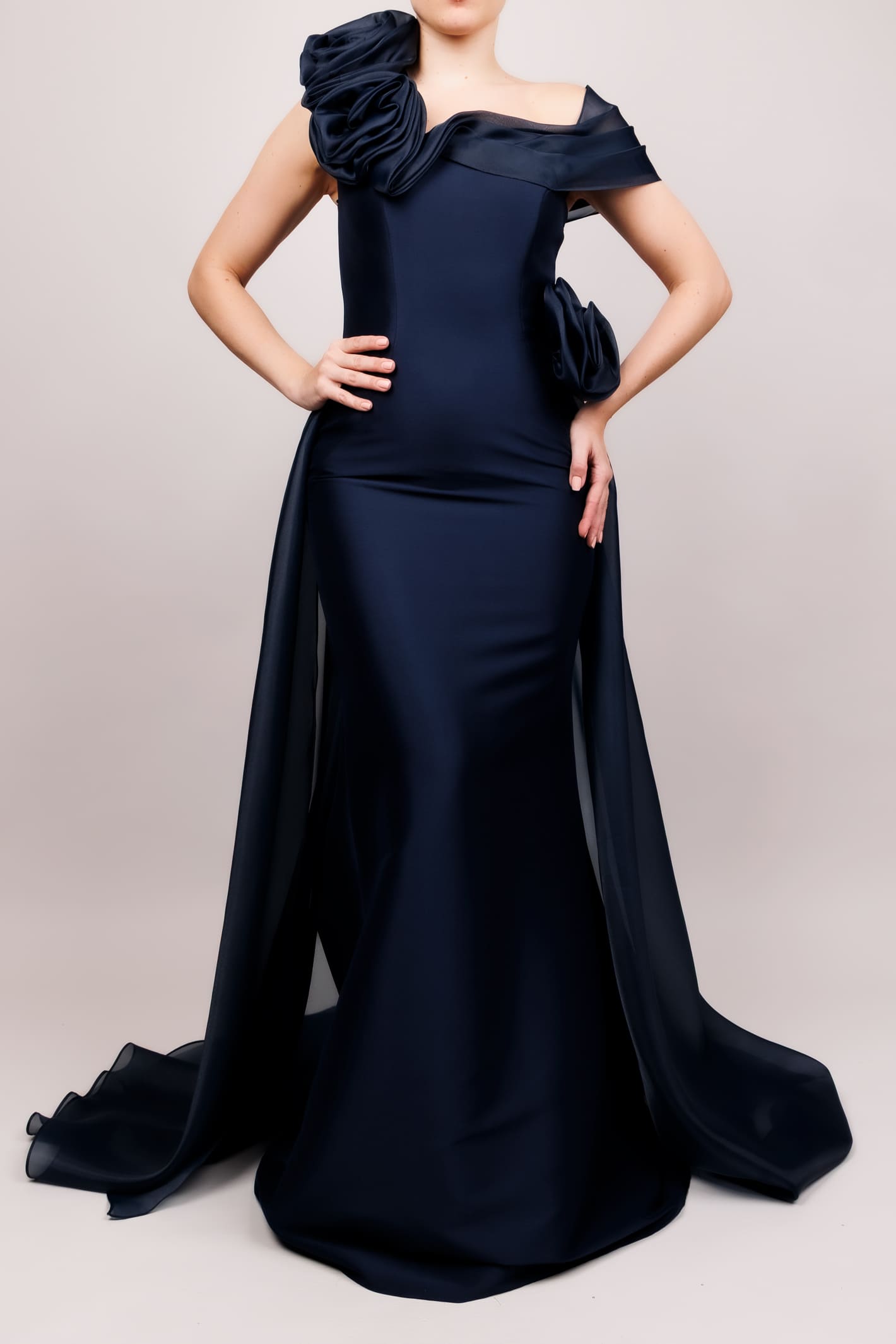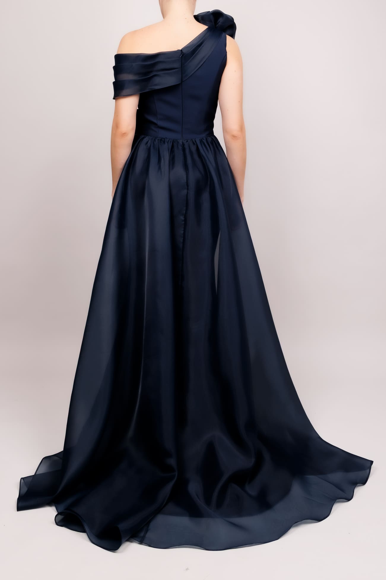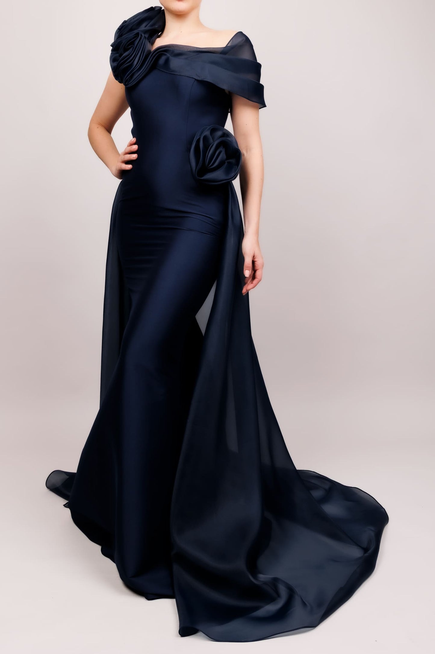 Vestido un hombro doble flor y cauda organza azul marino