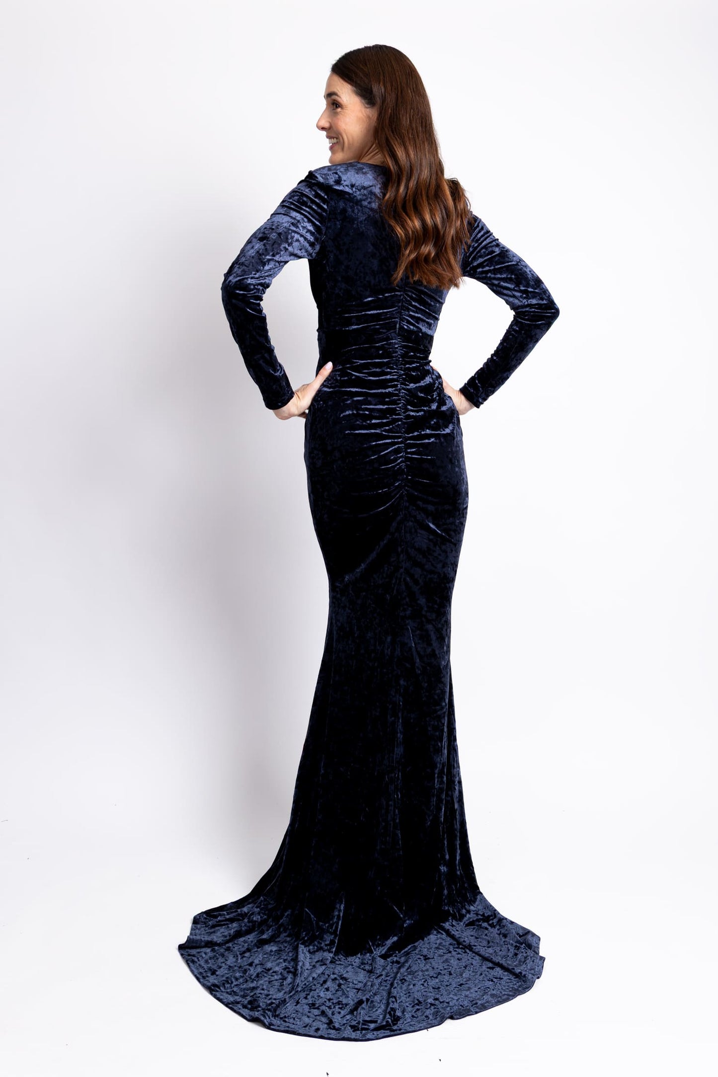 Vestido v manga larga de terciopelo con cauda azul