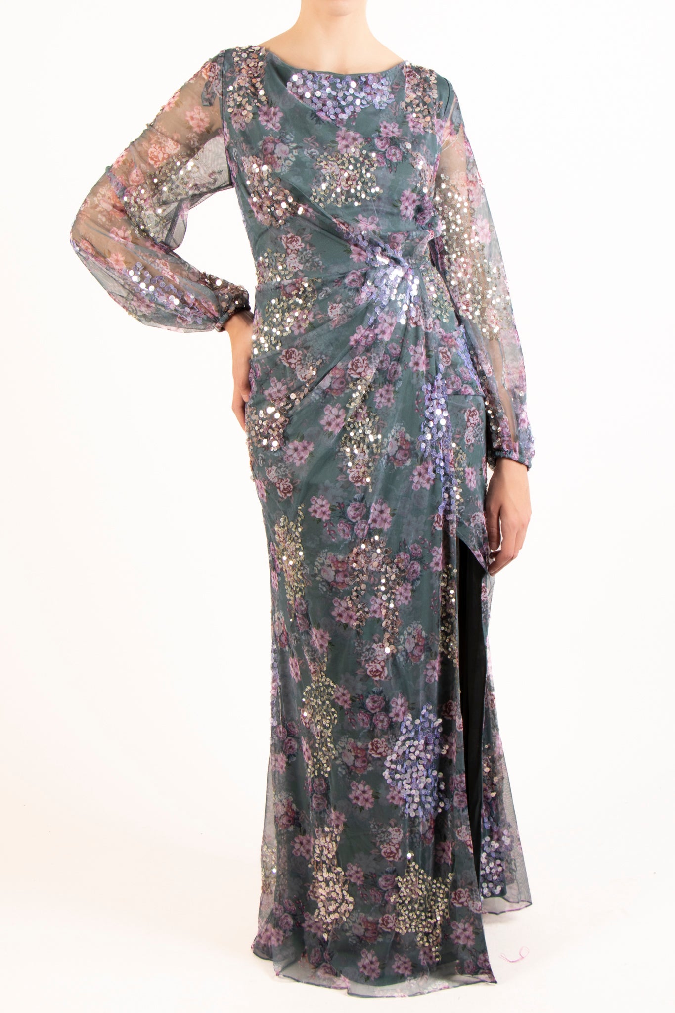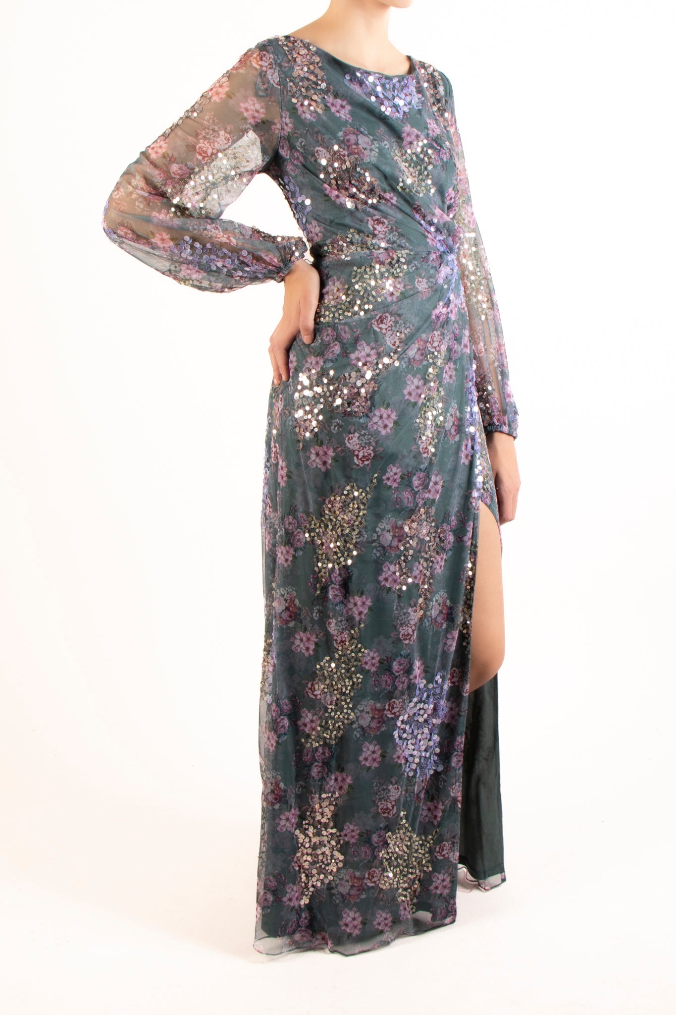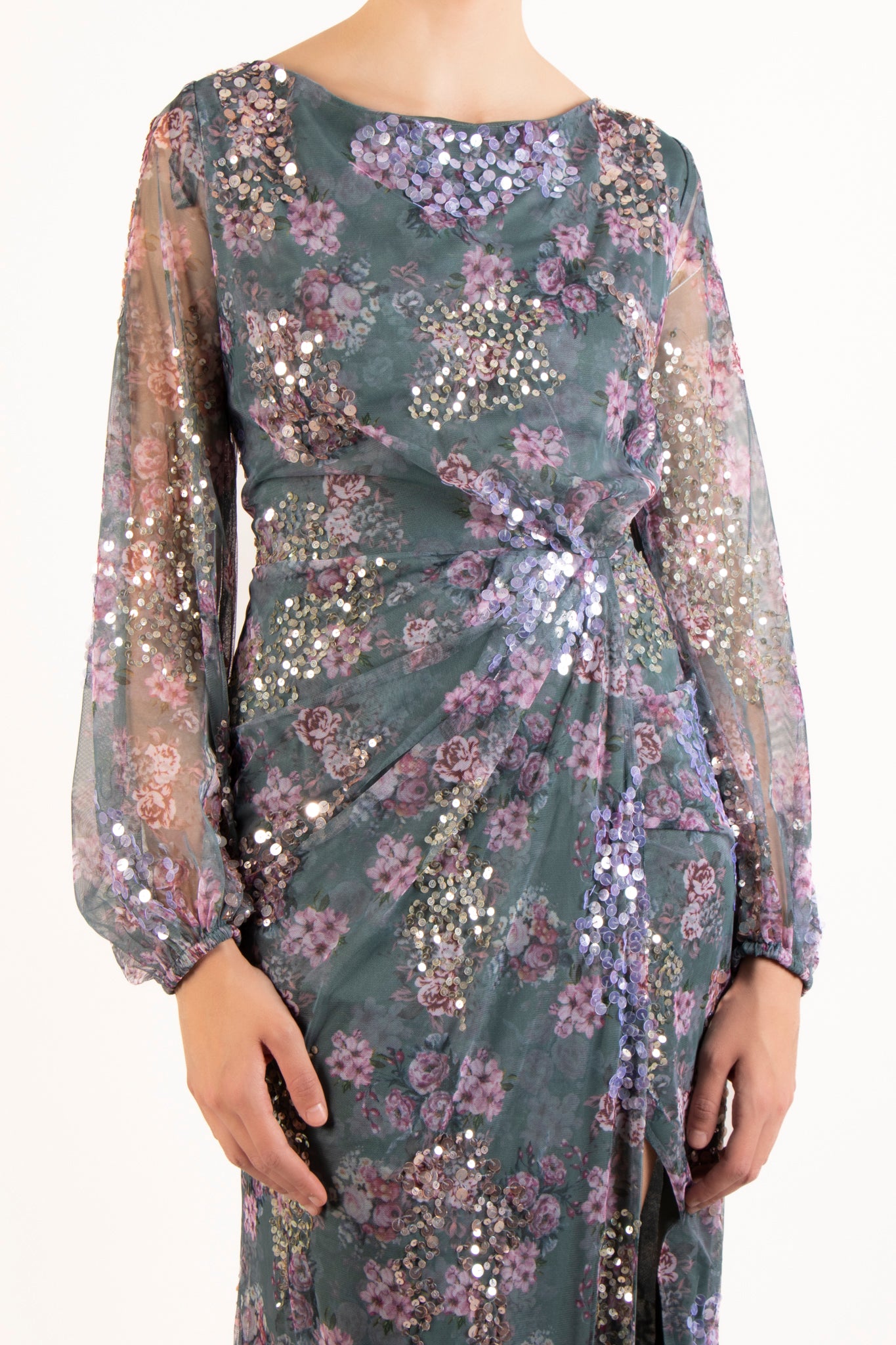 Vestido bordado manga larga gris multi