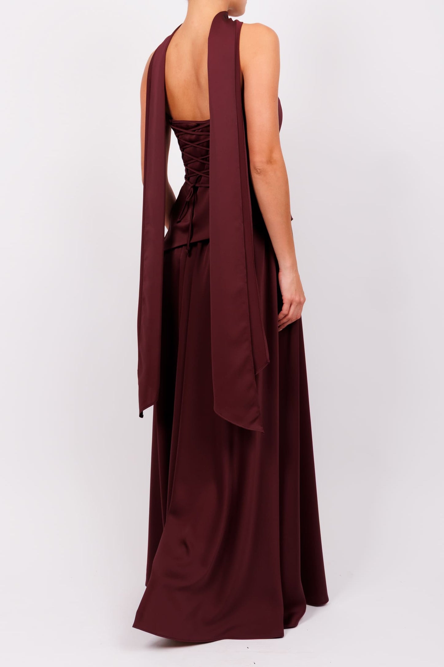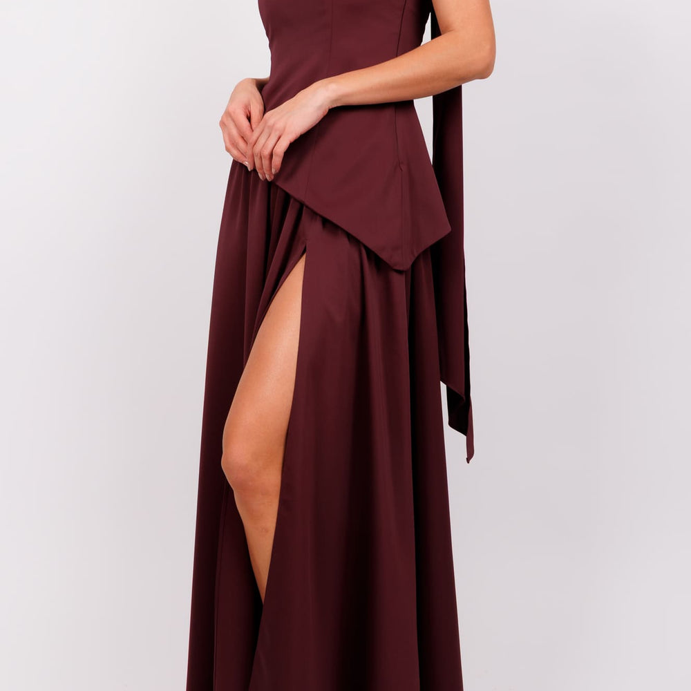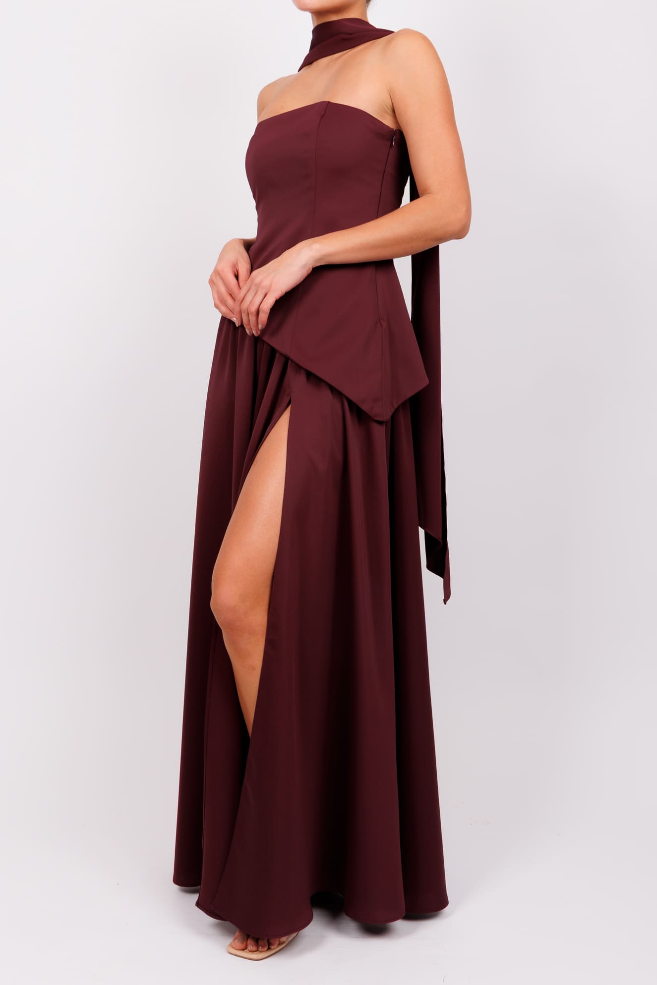 Vestido strapless corte asimetrico y pashmina vino