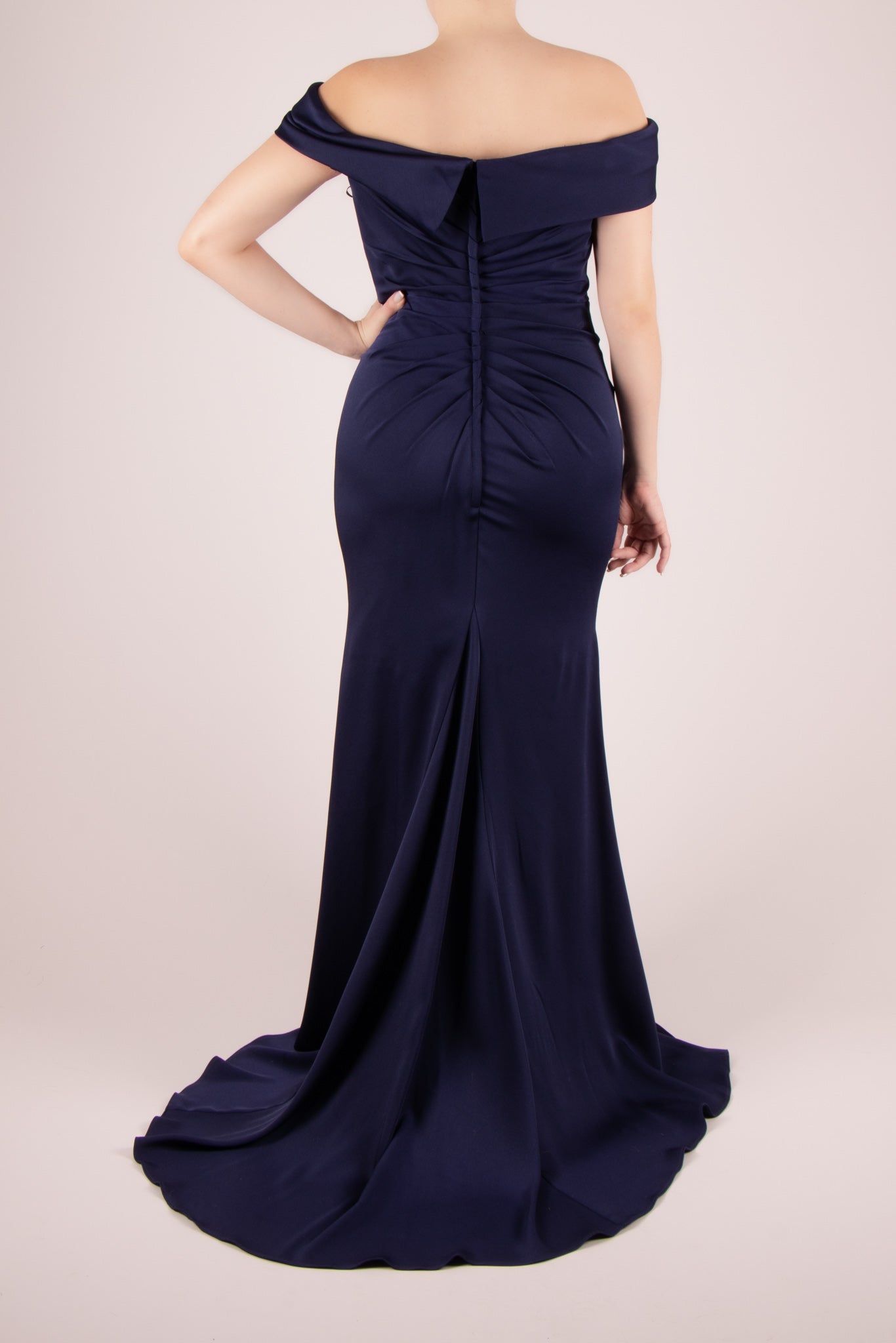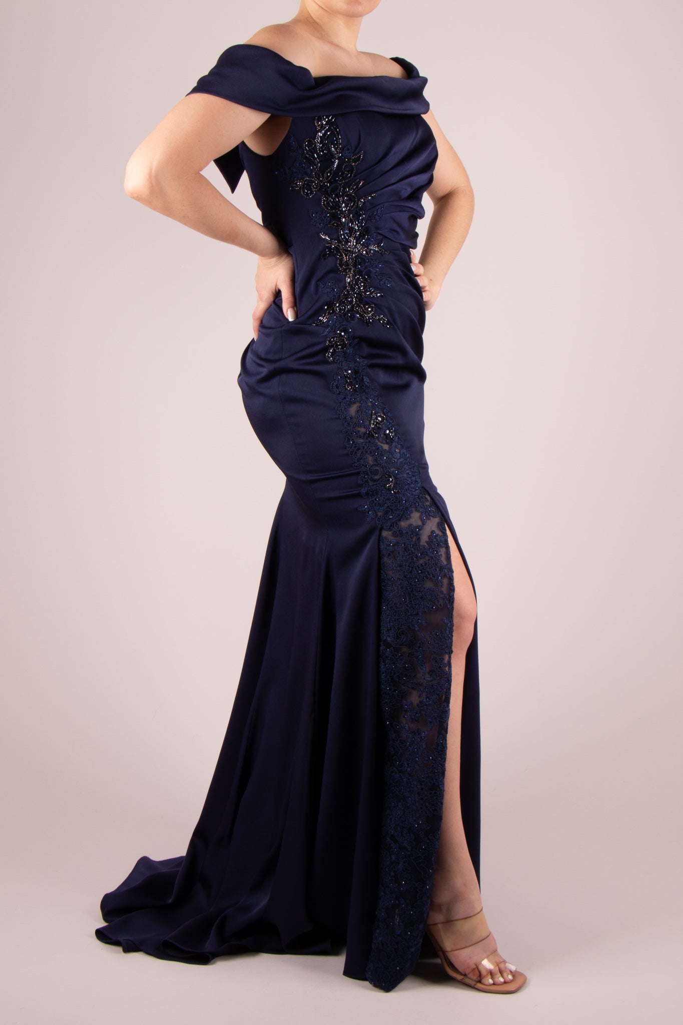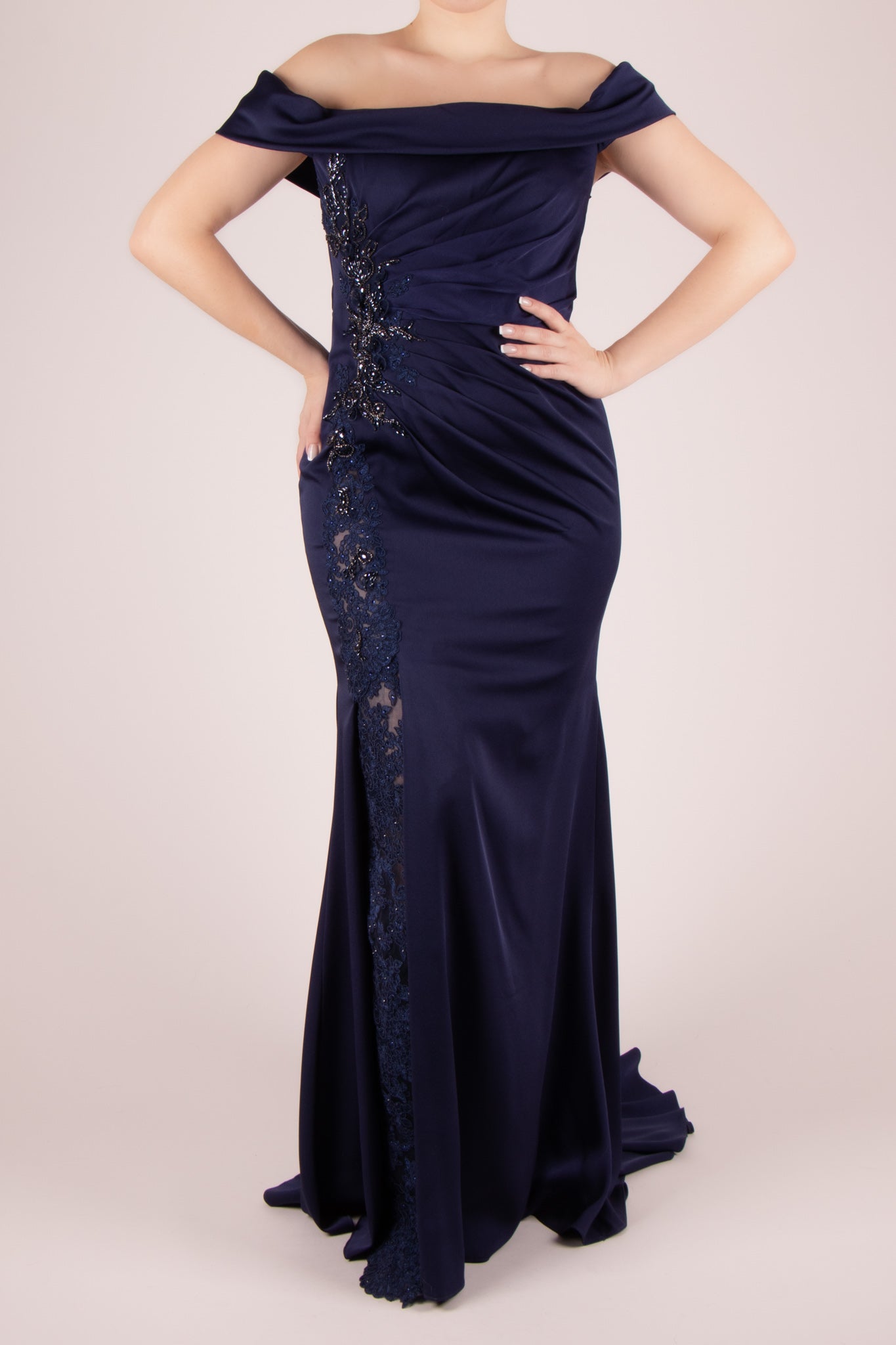 Vestido off the shoulder sirena bordado azul marino detalle en pierna