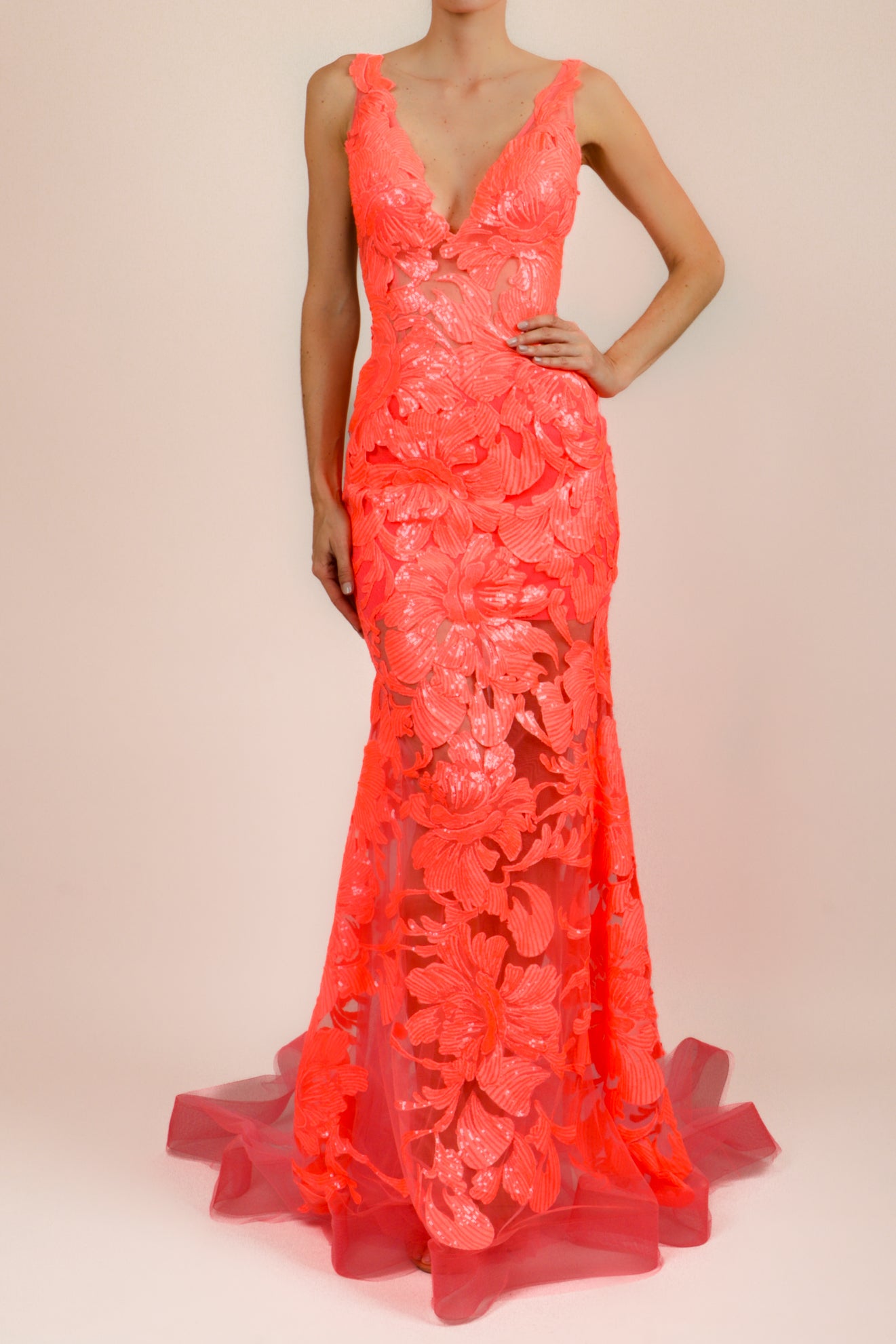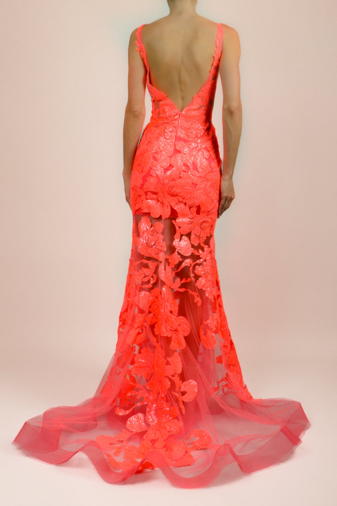 Vestido v bordado sirena neon coral
