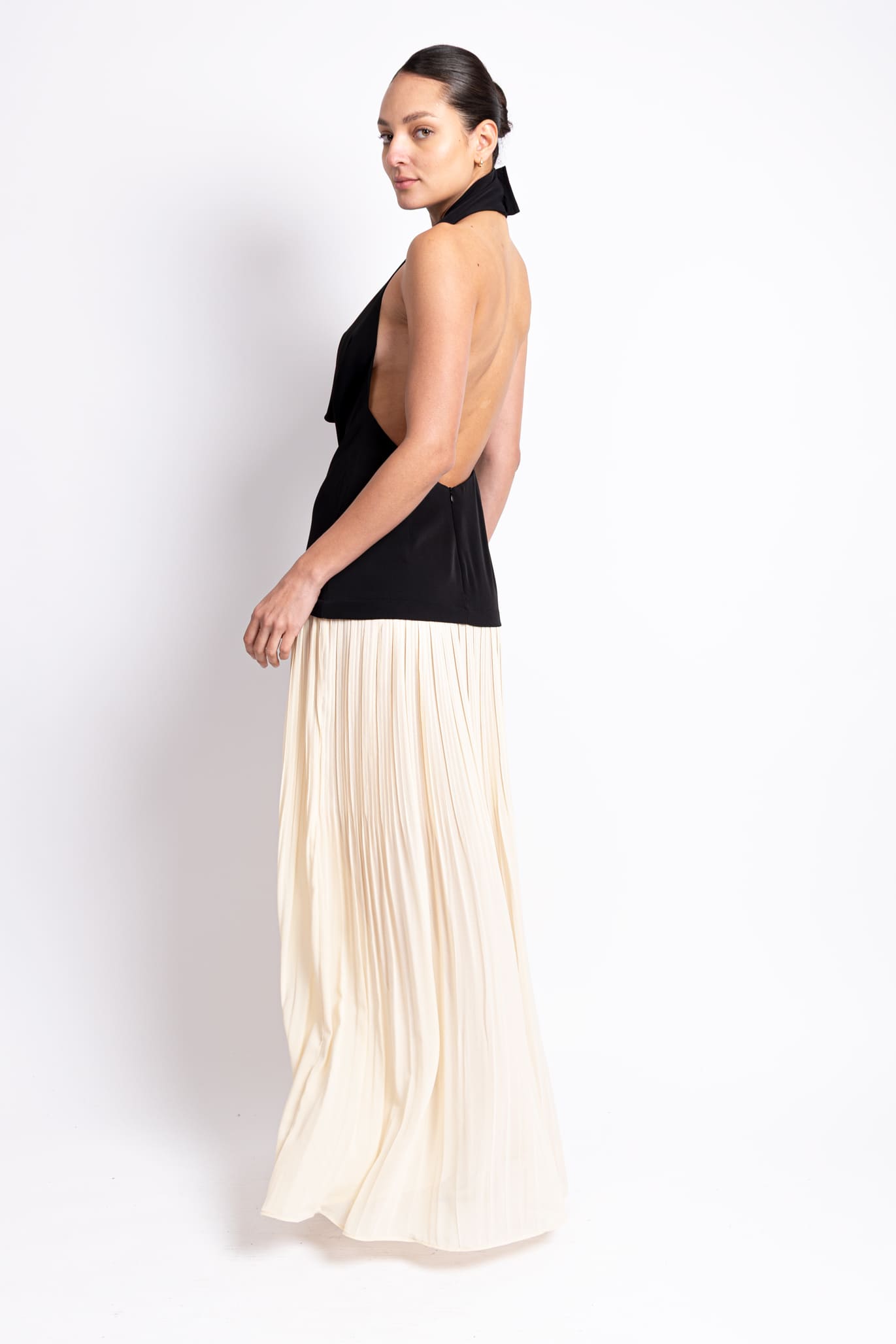 Vestido halter negro con falda plisada beige