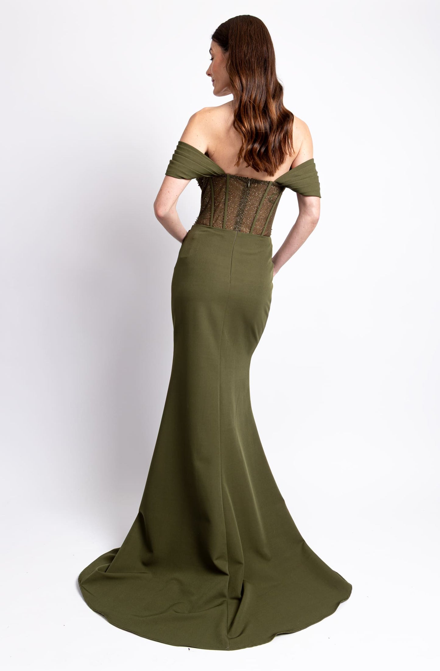 Vestido off the shoulder con bustier bordado olivo