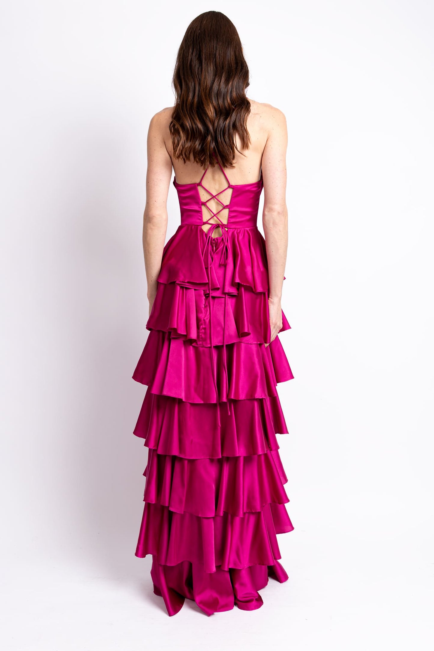 Vestido strapless con multi olanes de satin fucsia