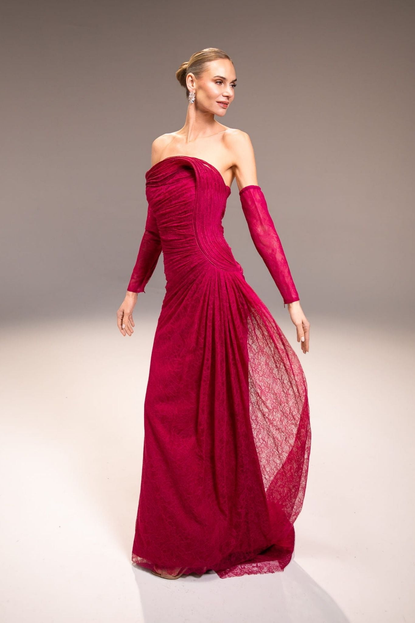 Vestido strapless de encaje mangas desmontables magenta