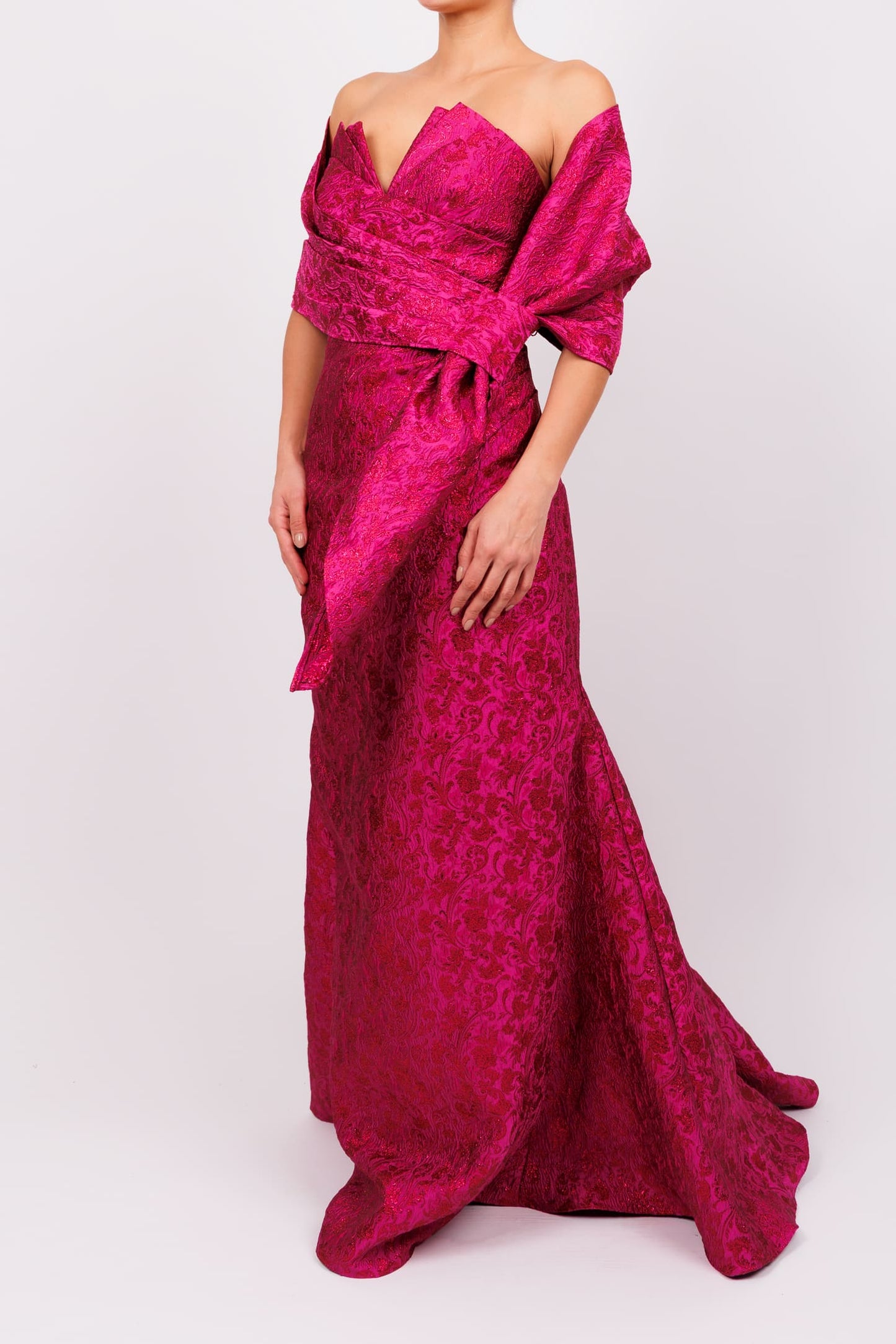 Vestido strapless v brocado fucsia