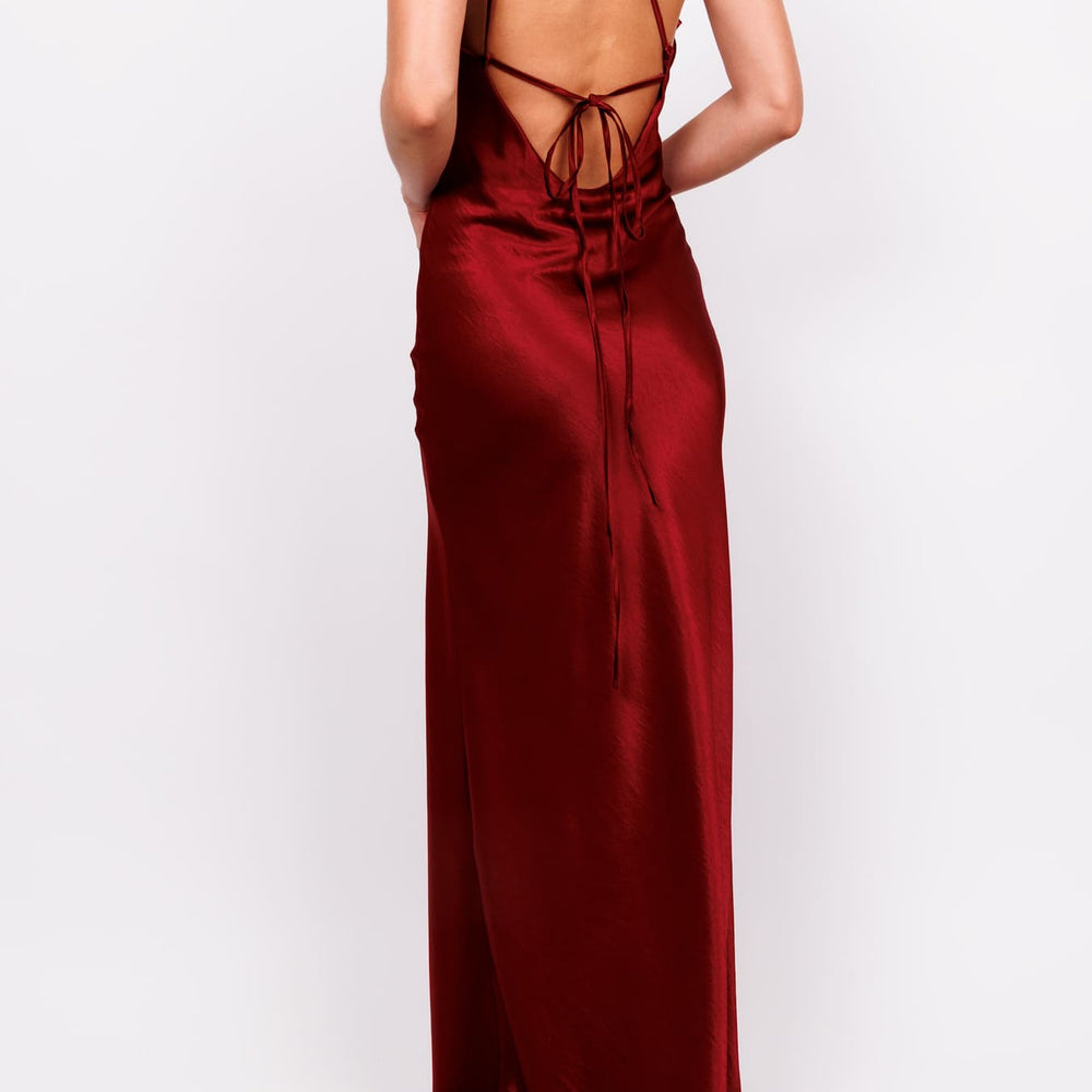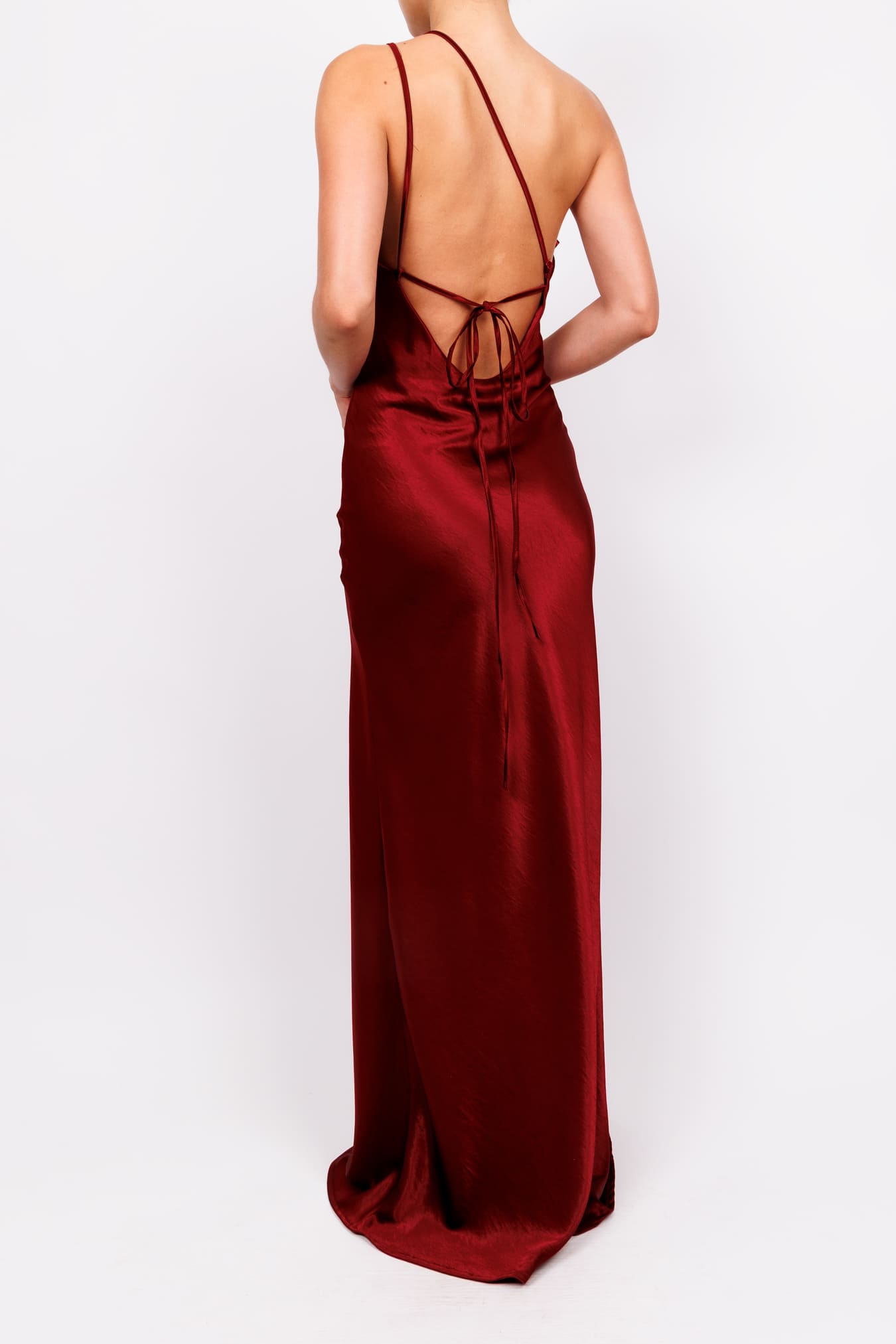 Vestido un hombro de satin con lazo vino
