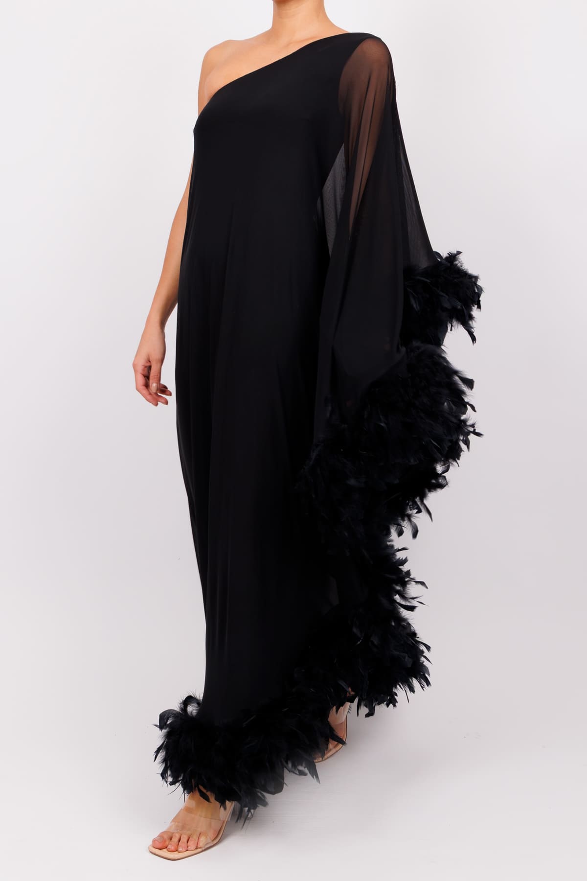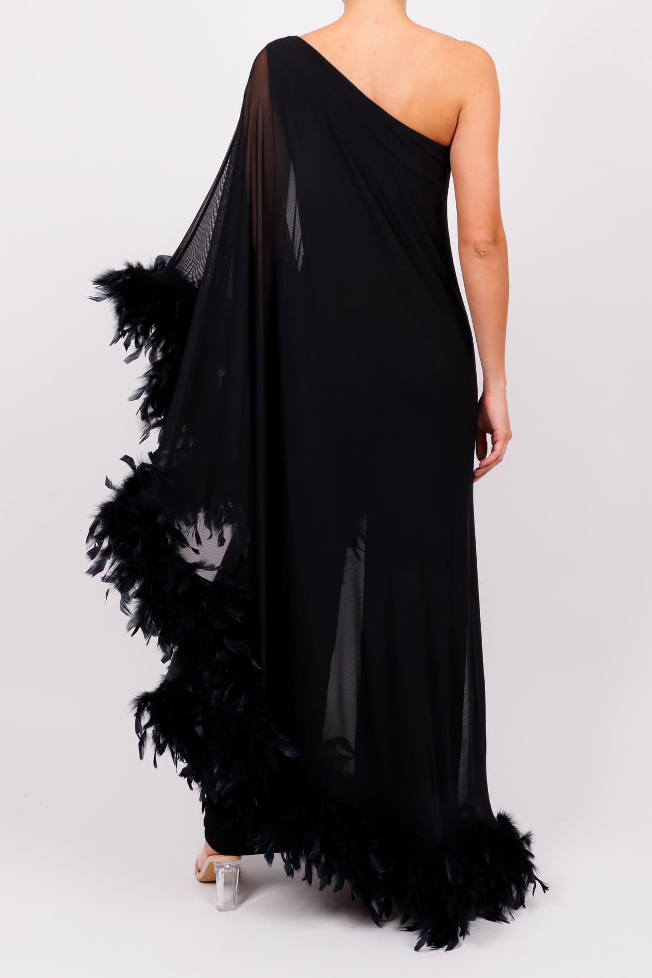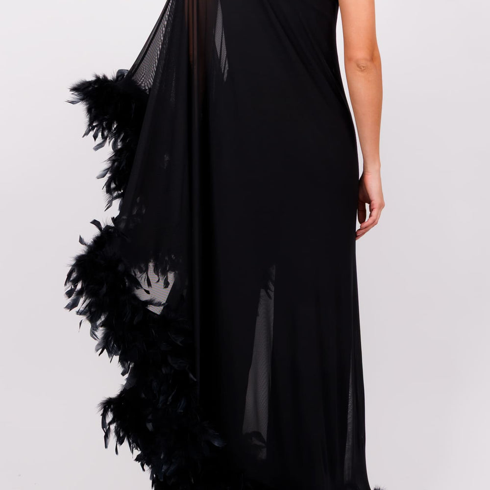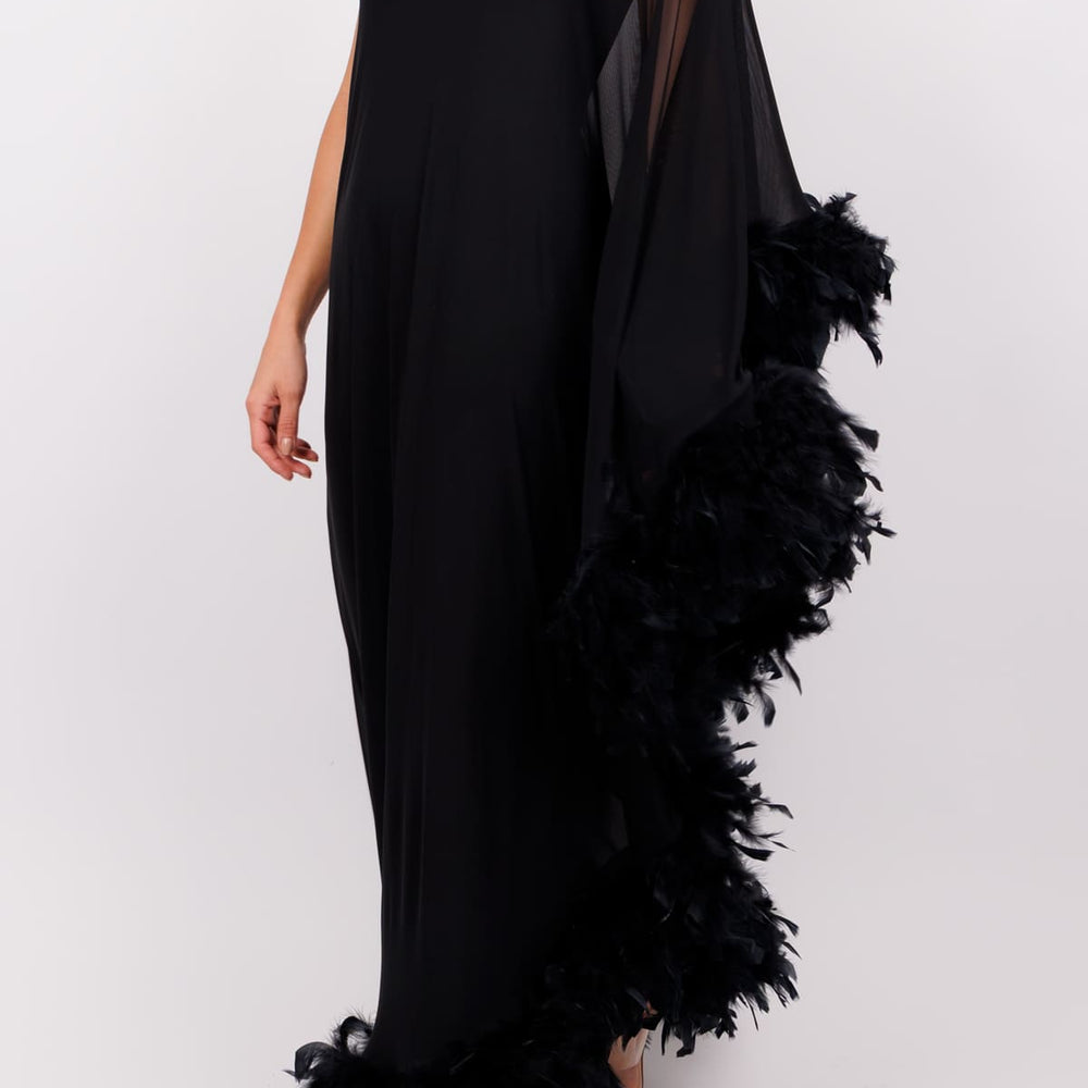 Jumpsuit una manga tipo capa con plumas negro