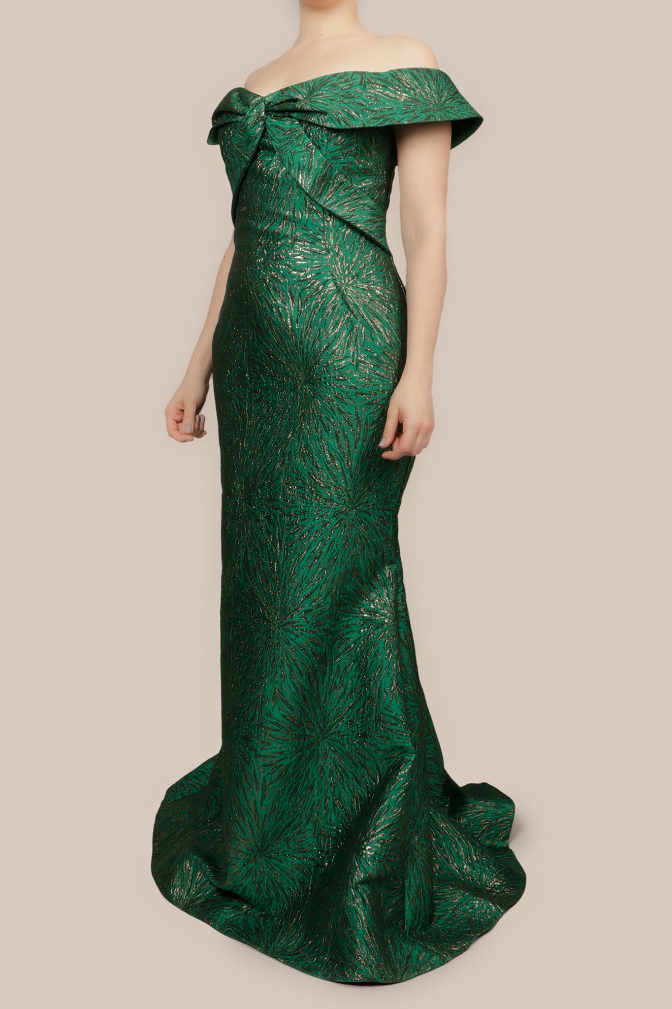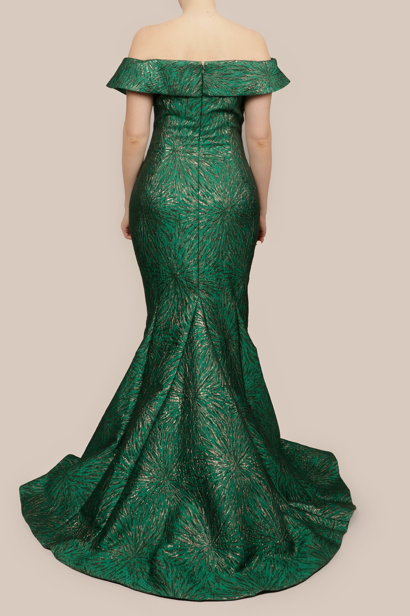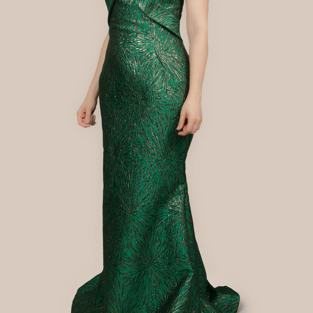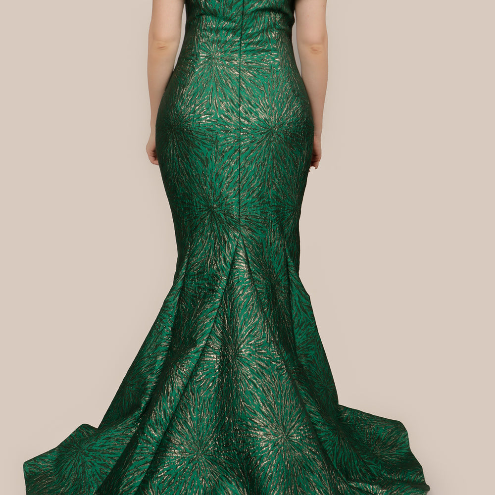Vestido brocado off the shoulder verde