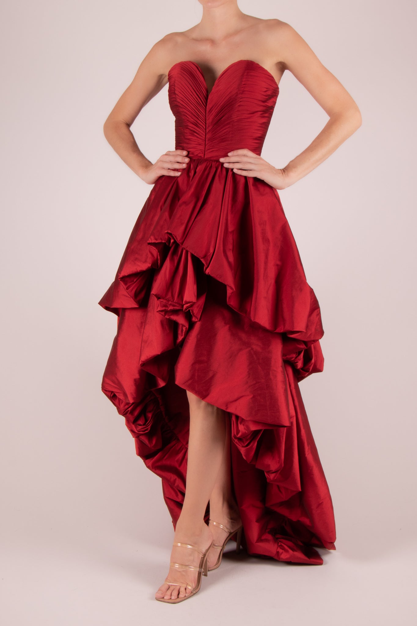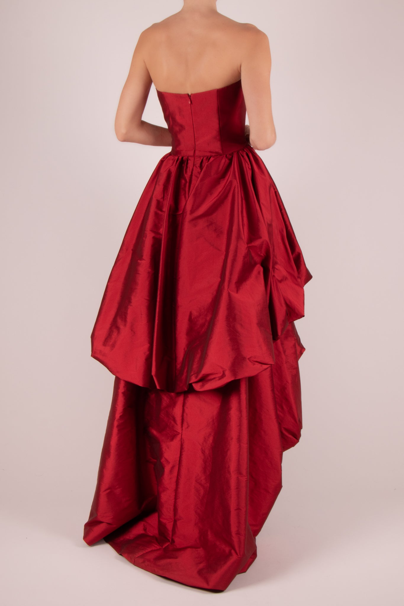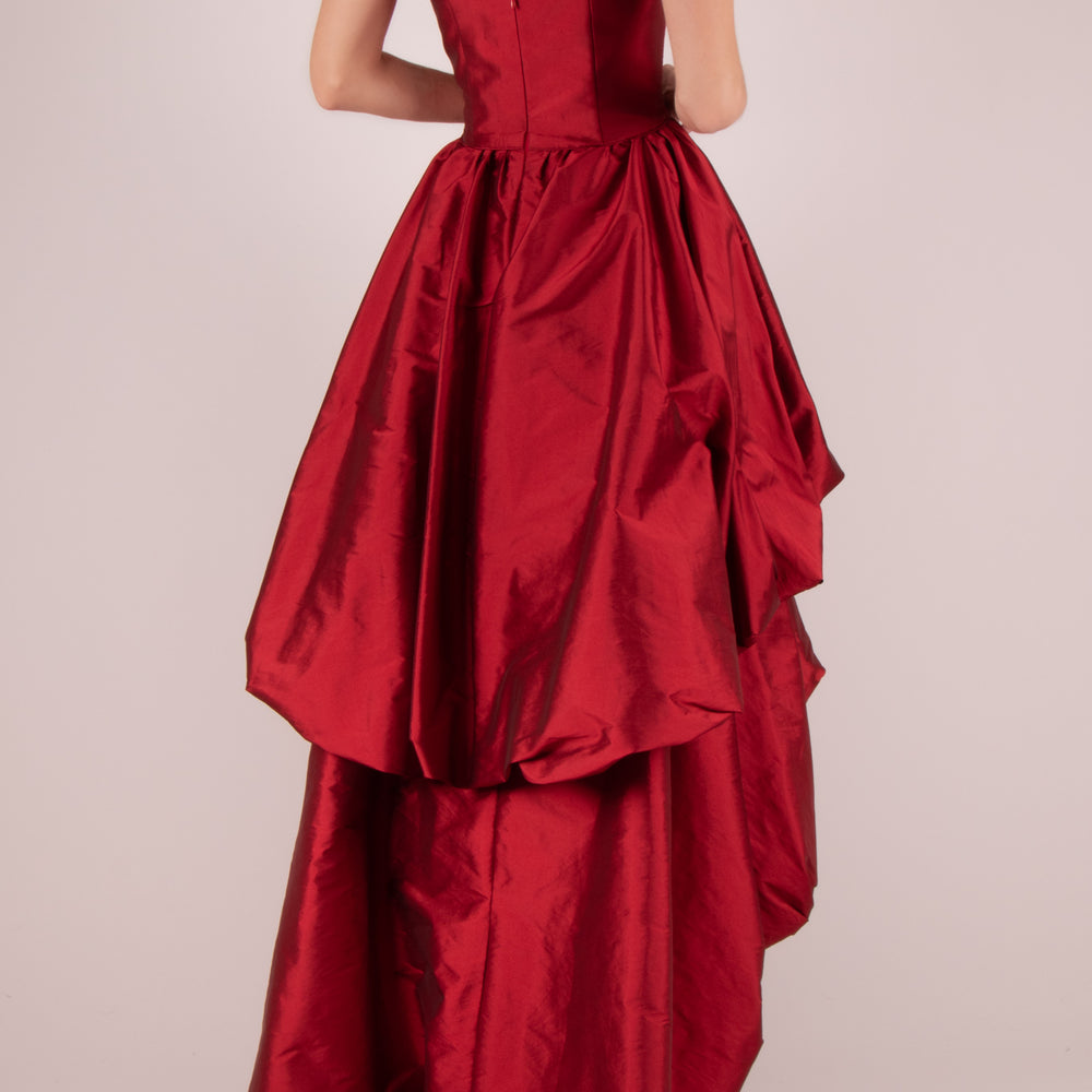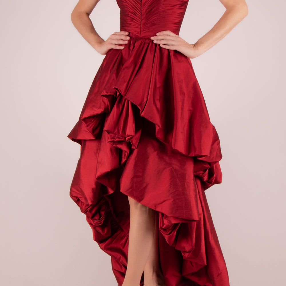 Vestido strapless drapeado capas vino