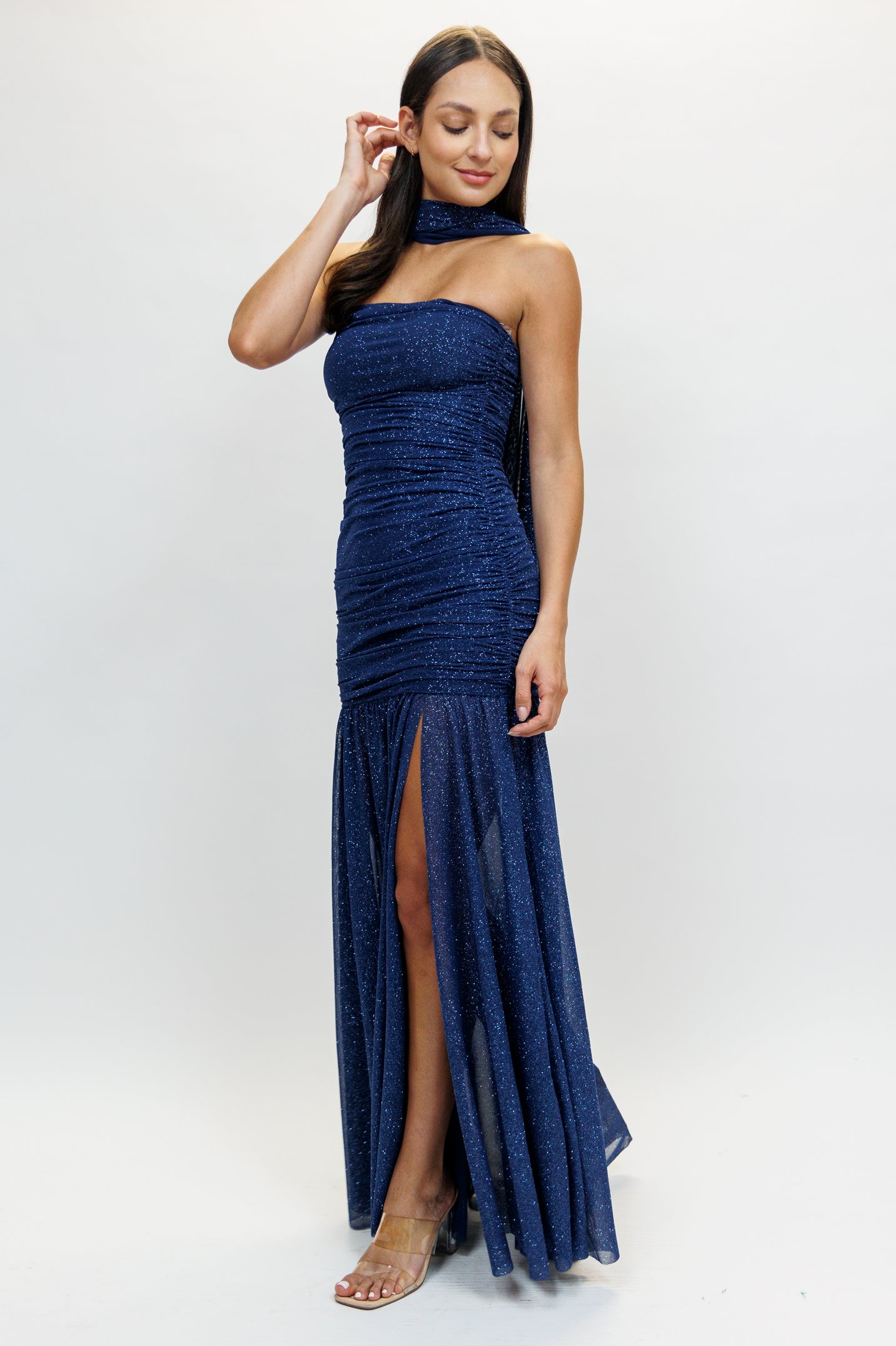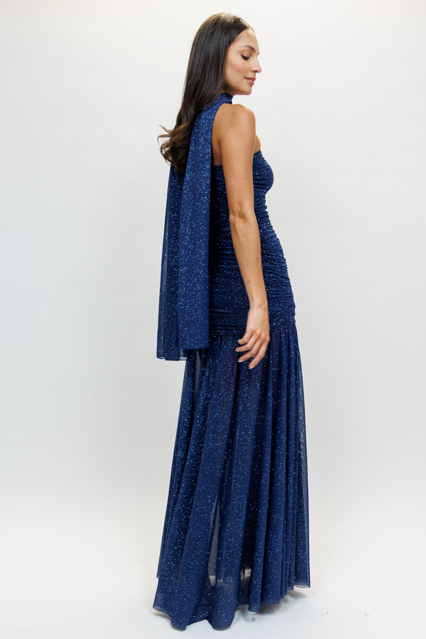 Vestido strapless mesh glitter con pashmina azul